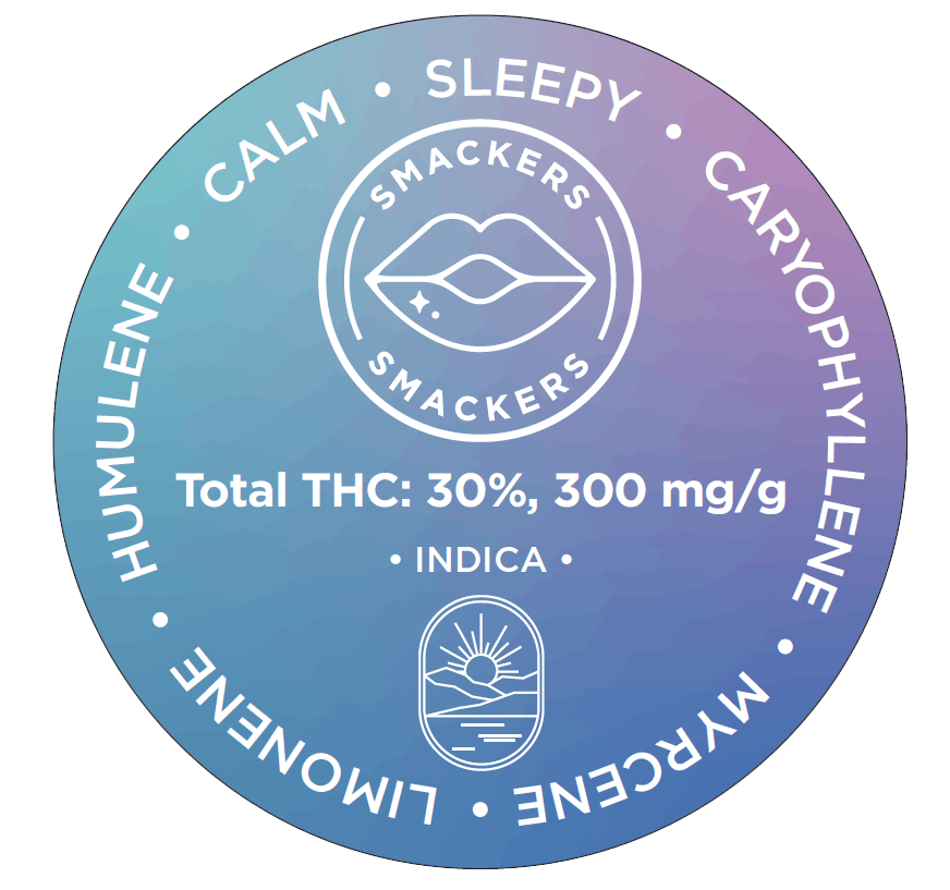 Smackers was bred and hunted by Purple City Genetics in Oakland and grown by us. A cross of two of our favorite strains, GMO and Gush Mints. Flower is purple with bright green accents and a heavy helping of trichome. Flavors and smell of sweet cream, garlic, and gas/petrol. It boasts up to 30% THC and has plenty of indica benefits, including a strong, sedating body high and mental calm. 14 grams of premium hand trimmed smalls, packaged in a glass jar with a Boost humidity pack to ensure freshness. Inhale - Exhale - Elevate