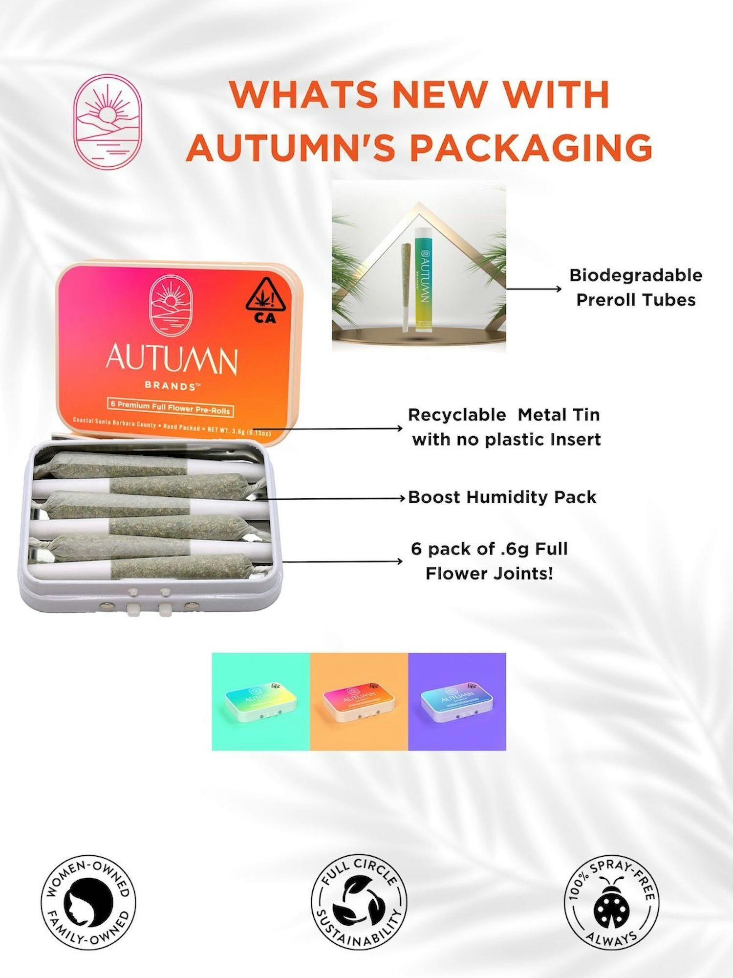 Autumn Brands is a family/50% women owned and operated company. We grow pesticide free plants on our farm in coastal Santa Barbara County. All of our flower is hang dried and hand trimmed and gets a slow cure before packaging. We Produce all our prerolls and hand fill all our jars on-site to ensure the highest quality, plus they come with a boost humidity pack to keep it that way. What that means for you is consistency and quality you can trust every time because we don't rely on other people. We’re on a continual harvest schedule meaning we produce product all year round, so buy with confidence knowing that Autumn Brands is as fresh as they get. We also believe in leaving the planet a better place so we're indoor sun grown(greenhouse), we recycle our water and plant stalks and don't spray any pesticides, herbicides or fungicides. From our family to yours we thank you for the support!