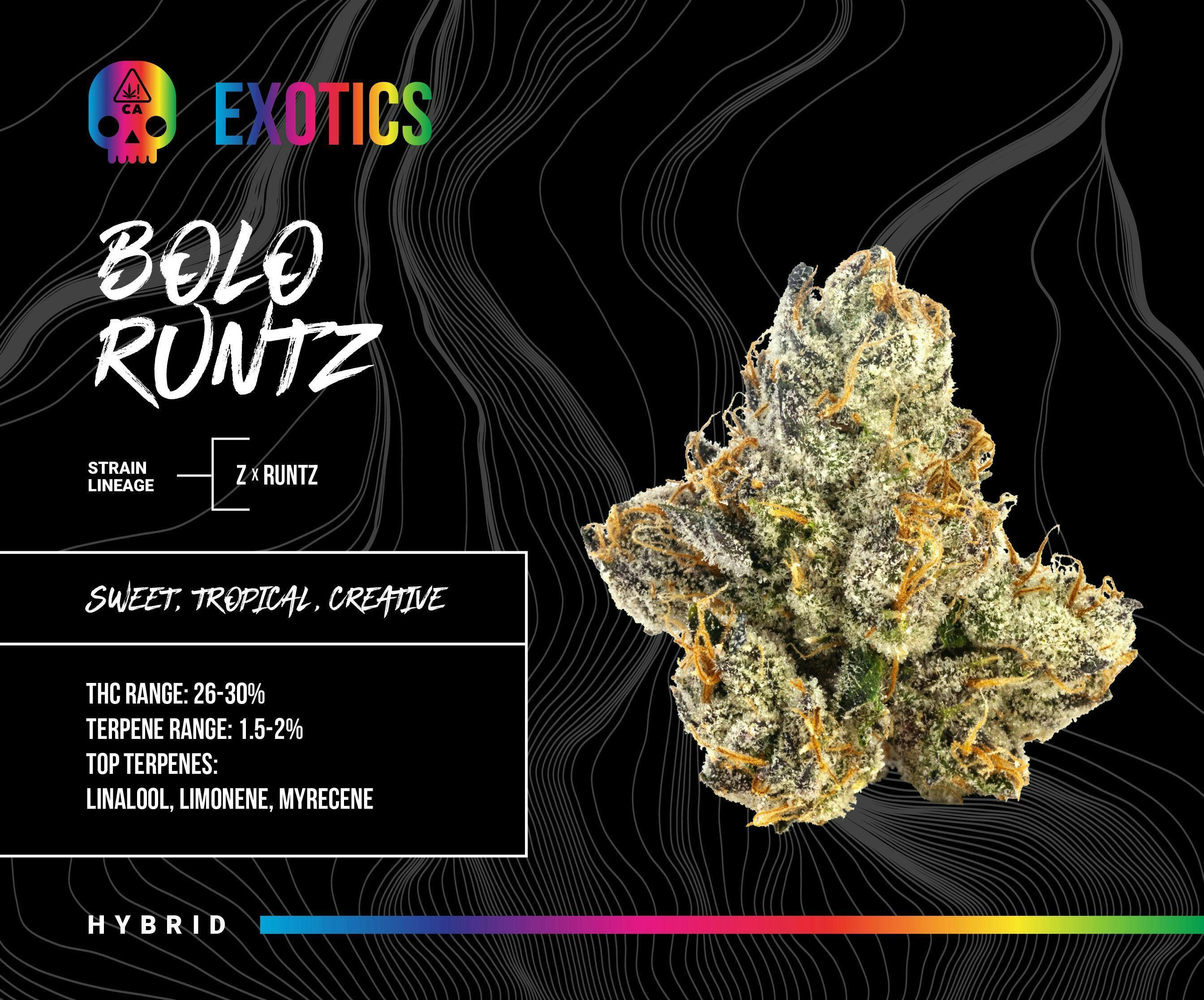 BE ON the LOOK OUT for for the rare Bolo Runtz with candied tropical fruit flavor. bright green and violet nugs, that boast fiery orange pistils. Expect a creative, trippy, and zoned out scenario.