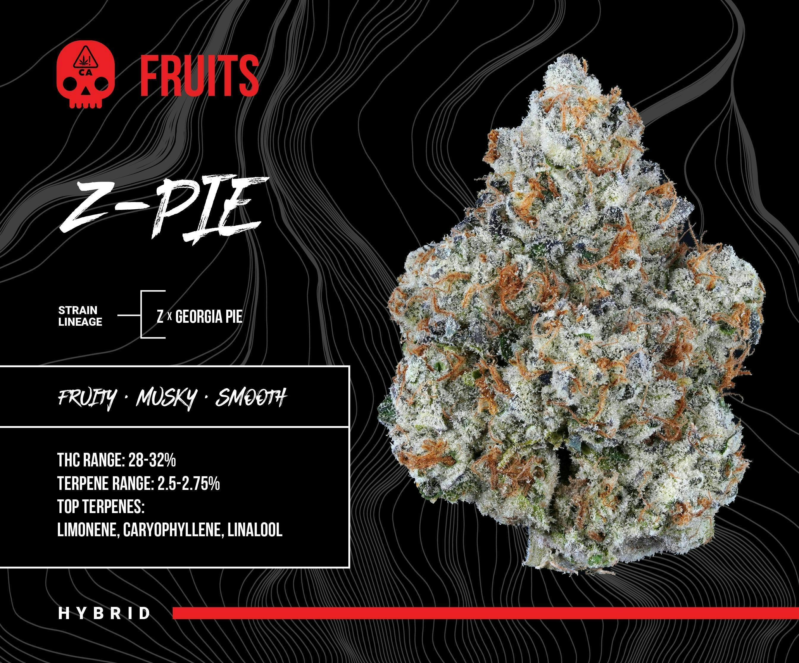Z-Pie hits with a fresh strawberry, melon and musky gas. The light green, sparkly nugs are sticky as hell and pack a fast-hitting lift. The high is tingly and floaty, relaxing without fogging you up—until it melts into pure cozy comfort. Perfect for unwinding and sinking into the couch.