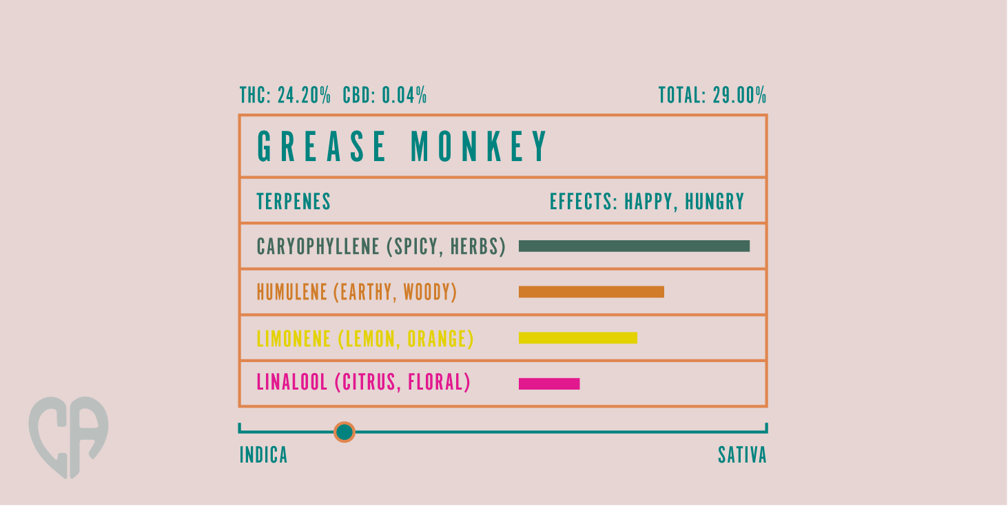 Grease Monkey is a sweet hybrid marijuana strain with earthy and skunky overtones. This strain is a cross of GG4 x Cookies and Cream and saddles the consumer with a lazy, munchie-fueled body buzz that may soften the blow of chronic pain, nausea, and stress.
