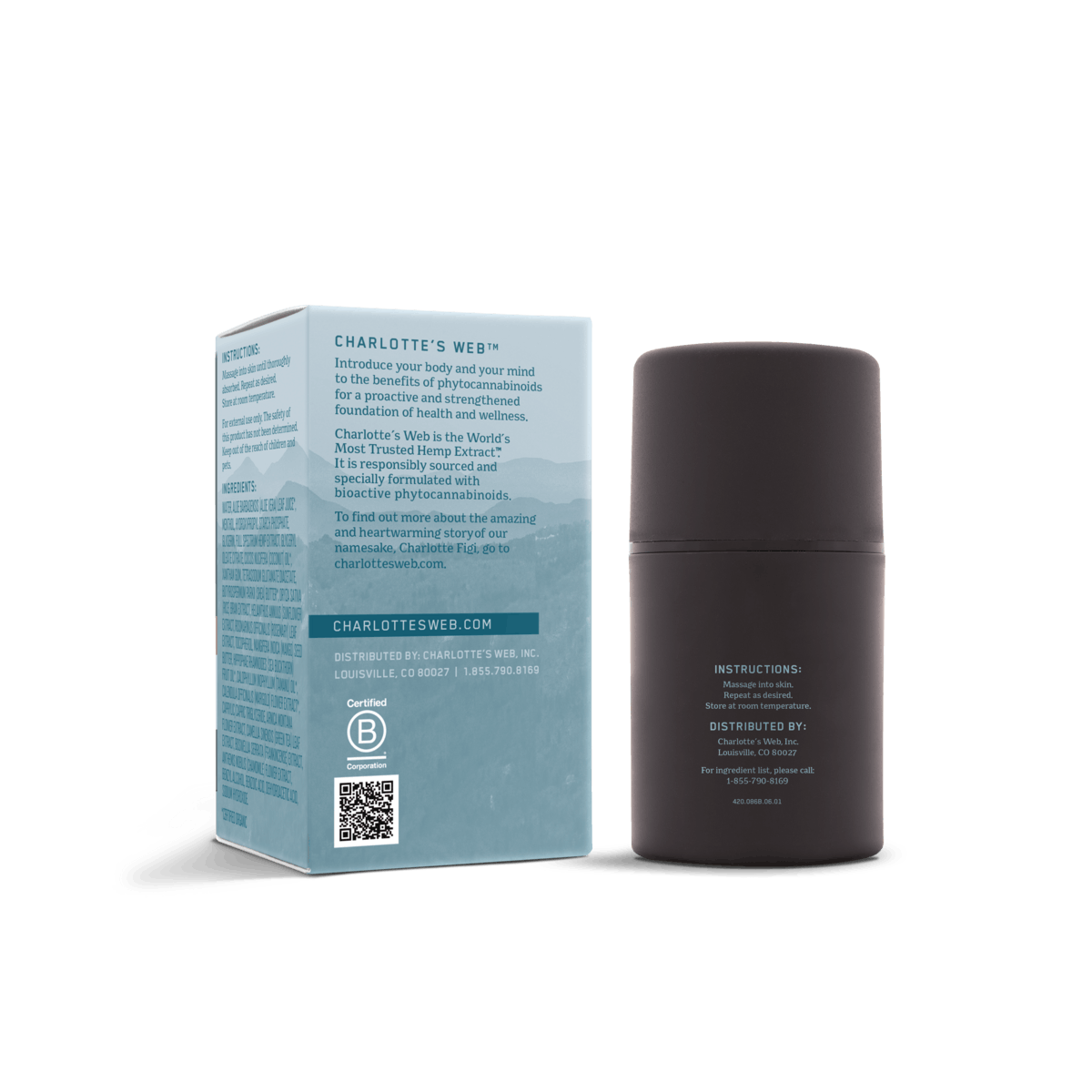 Apply day or night, as needed.Avoid contact with eyes.Charlotte's Web™ products are made from our world-renowned hemp genetics grown 100% in Colorado. Charlotte's Web is a family owned Colorado Company and the exclusive provider of Charlotte's Web, the World's Most Trusted Hemp Extract™. Founded by the Stanley Brothers of Colorado, Charlotte's Web leads the industry in quality, safety, consistency and social responsibility to improve thousands of lives daily through the use of Charlotte's Web. At Charlotte's Web, we are driven by principles that extend far beyond the bottom line. It is our goal to provide products of the highest possible quality, while contributing to the sustainability of the communities we have the privilege of serving. Our social responsibility pledge extends to organizations like the Realm of Caring Foundation, and all of our clients can be proud that a portion of each purchase will be pledged to the Realm of Caring Foundation toward the advancement of education, research and compassion.