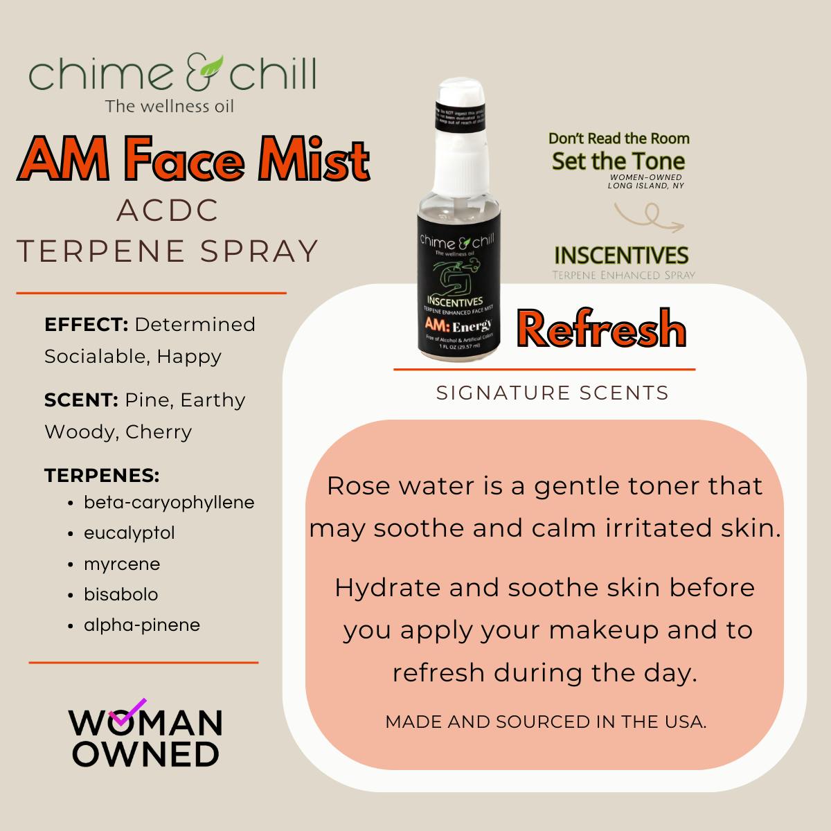 Layer your AM InSCENTives Face Mist with your Chime&Chil oral solutions and topicals, or with your other cannabis inhalables and ingestibles to elevate your cannabis experience as you start your day.