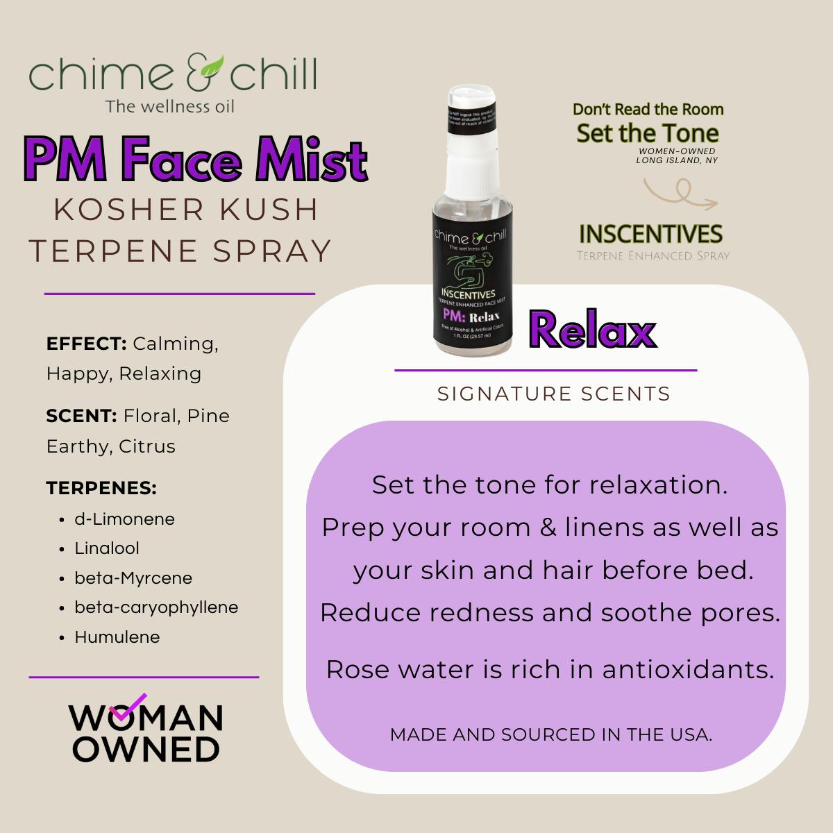 Layer your PM InSCENTives spray with your Chime&Chill AM / PM oral solutions or with your other cannabis inhalables and ingestibles to elevate your cannabis experience as you perform your evening rituals.