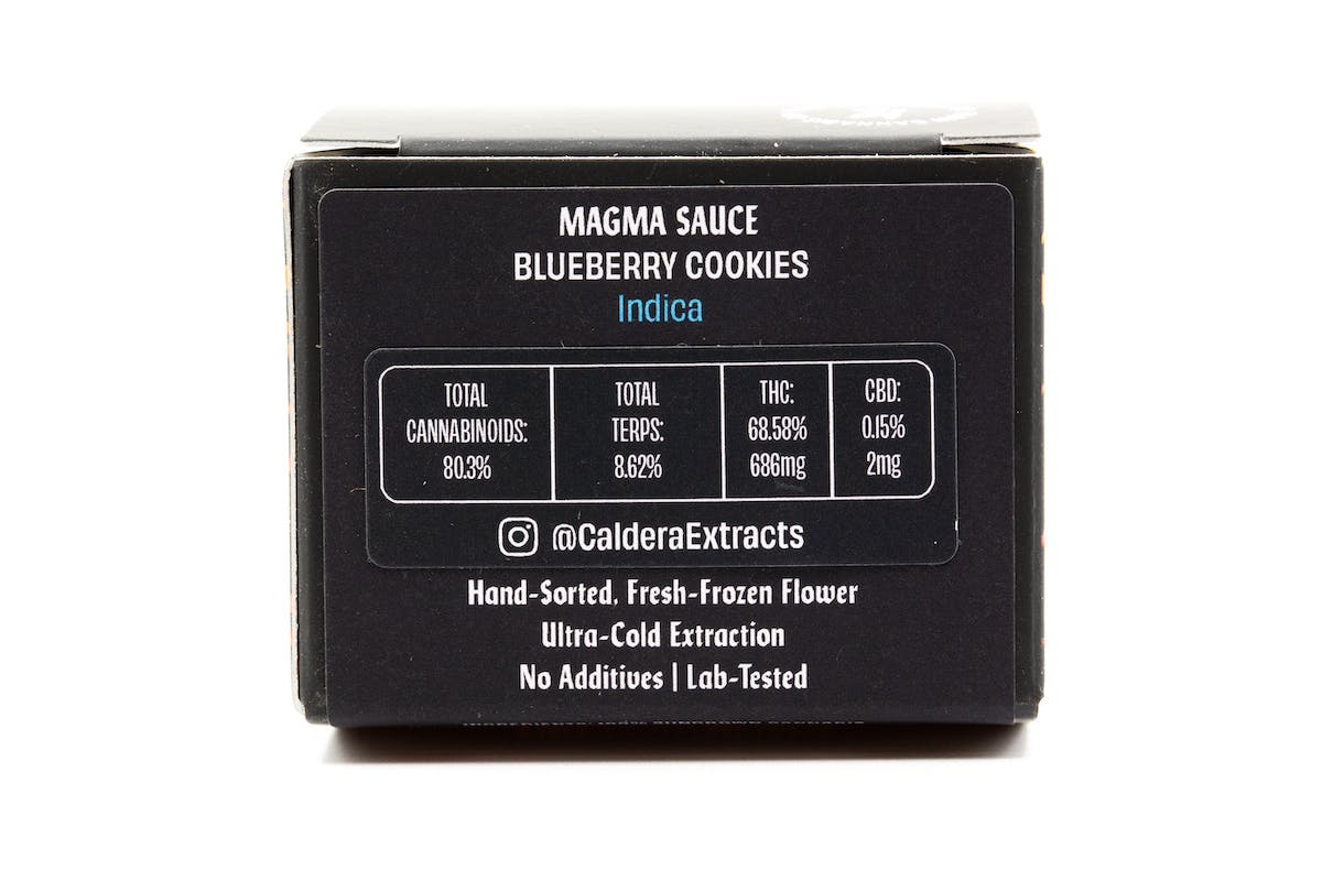 Blueberry Cookies tastes like sweet blueberry muffins and creates a sensory experience with a potency that’ll blast you into a relaxing, blissful state. Blueberry Cookies Magma Sauce is an Indica cross of Blue Tahoe and Thin Mint GSC. This Live Resin concentrate is made from 100% sungrown cannabis using an ultra-cold extraction process with High Terpene Extraction (8.62%) and THC (68.58%). Caldera Magma Sauce is created by evenly distributed THCa crystalline with luminescent clarity, creating a cocktail of liquids and solids for a slushy-like texture. The dominant terpenes are Myrcene, β Caryophyllene, and α Pinene, creating a complex terp profile for a full-spectrum, high Entourage Effect.