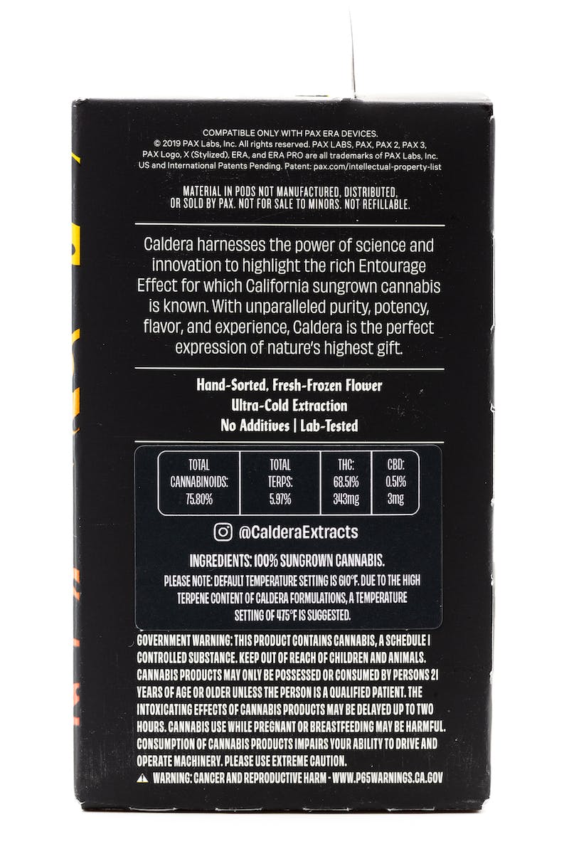 Caldera Pods are for the customer wanting extracts as close to the taste of flower as possible, curated with flare and functionality exclusively for PAX Era Devices. The full-spectrum, ultra-cold extracts are crafted from sustainably grown cannabis, fresh-frozen at harvest to optimize the diversity of terpenes and cannabinoids. Flavor is at the heart of all our formulations, achieved by only using naturally extracted terpenes- 5-8% per Pod.