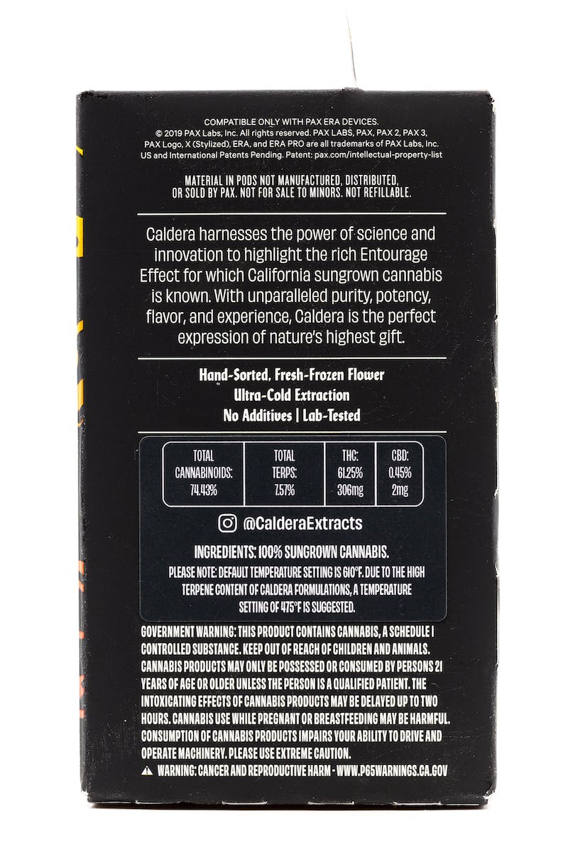 Caldera Pods are for the customer wanting extracts as close to the taste of flower as possible, curated with flare and functionality exclusively for PAX Era Devices. The full-spectrum, ultra-cold extracts are crafted from sustainably grown cannabis, fresh-frozen at harvest to optimize the diversity of terpenes and cannabinoids. Flavor is at the heart of all our formulations, achieved by only using naturally extracted terpenes- 7-8% per Pod.