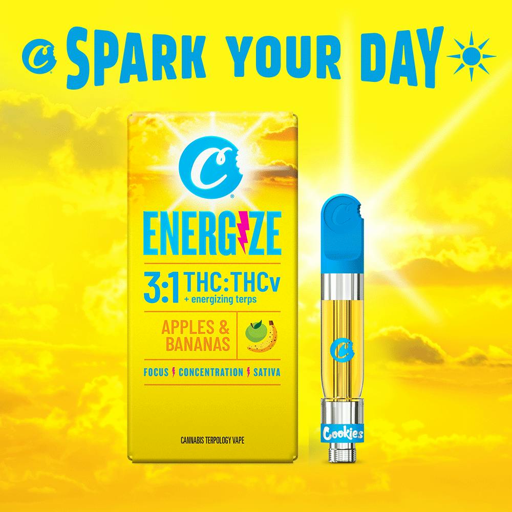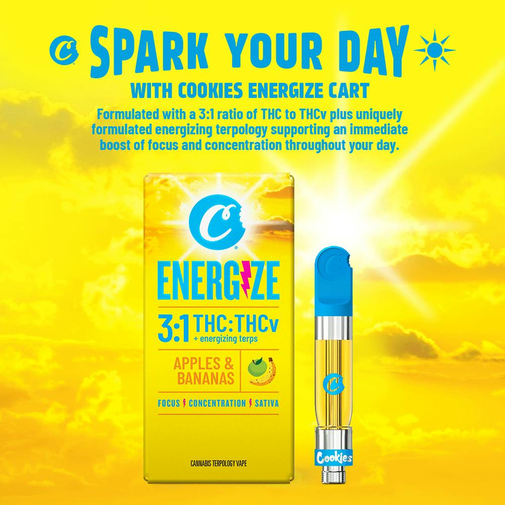 Spark your day with Cookies Energize Cart. Formulated with a 3:1 ratio of THC to THCv plus a uniquely formulated energizing terpology blend to help you get through your day.
