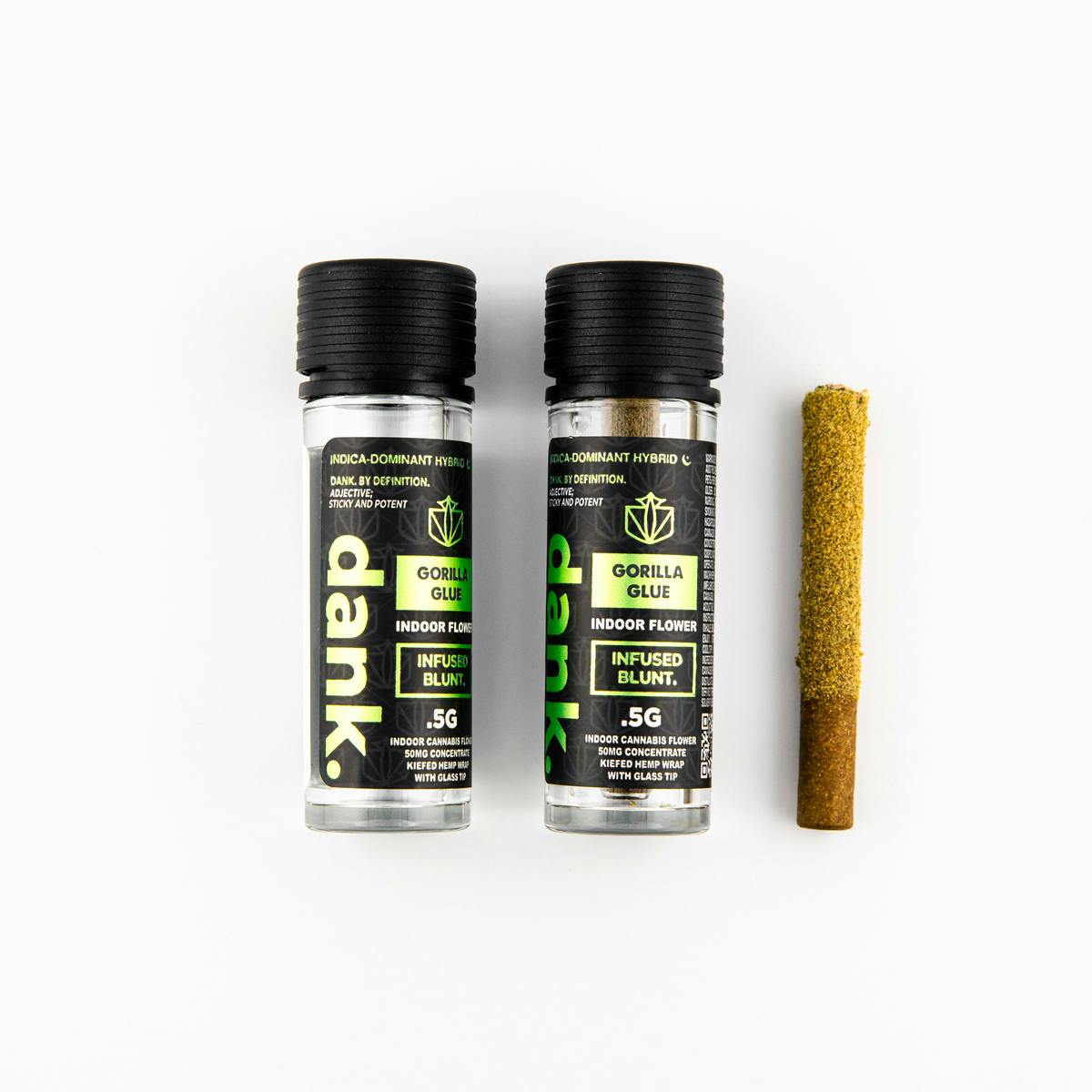 A half gram (0.5G) pre-roll blunt of premium DANK Gorilla Glue flower rolled in fresh hemp wrap coated in Kief with a glass tip and infused with 50MG of concentrate.