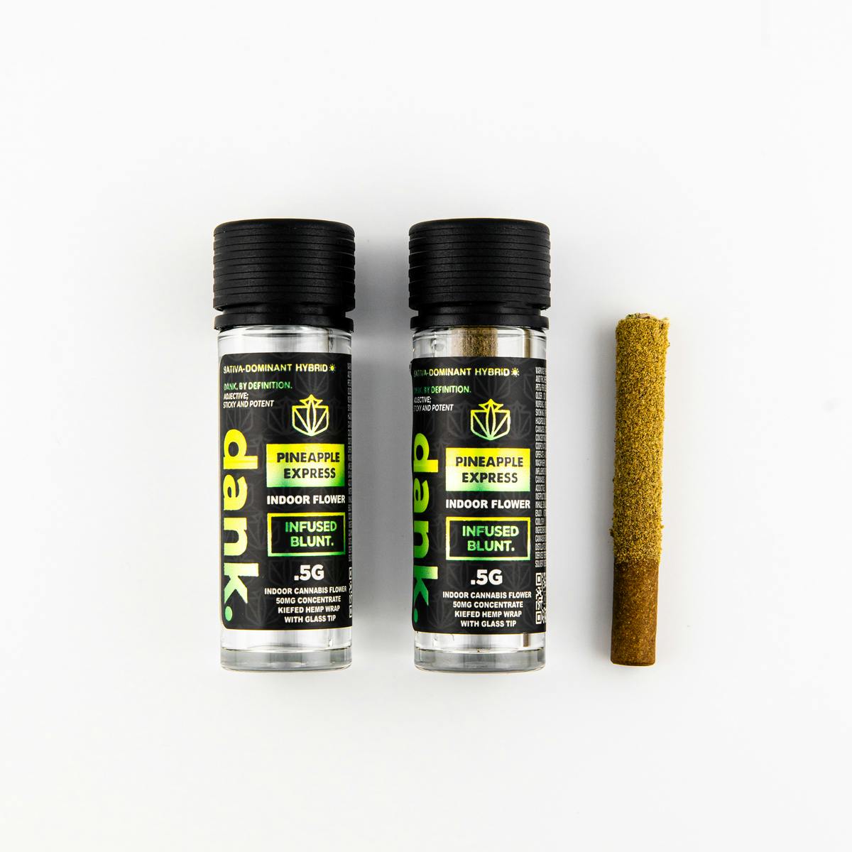 A half gram (0.5G) pre-roll blunt of premium DANK Pineapple Express flower rolled in fresh hemp wrap coated in Kief with a glass tip and infused with 50MG of concentrate.