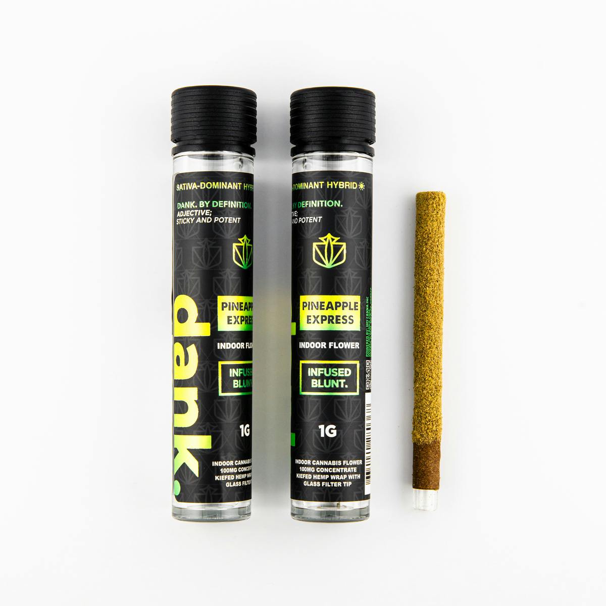 A one gram (1G) pre-roll blunt of premium DANK Pineapple Express flower rolled in fresh hemp wrap coated in Kief with a glass tip and infused with 50MG of concentrate.