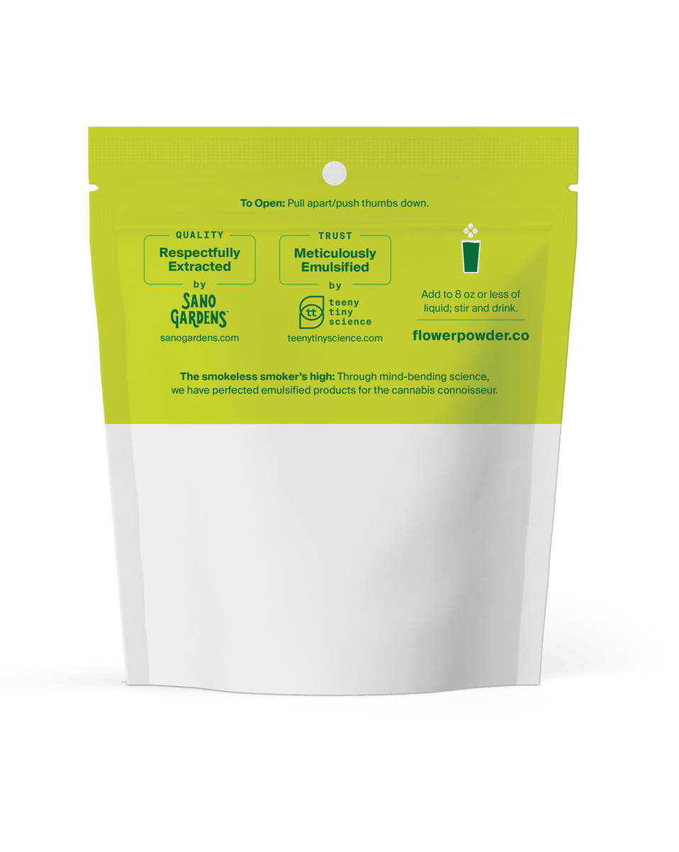 Flower Powder delivers a true smoker’s high in the convenience of an edible powder. Our quick-dissolving, fast-acting powder uses the entire cannabis flower, including its full strain-specific terpene profile. This allows your body’s THC absorption processes to deliver that unbeatable smoker’s high anywhere a joint would cause a stir.