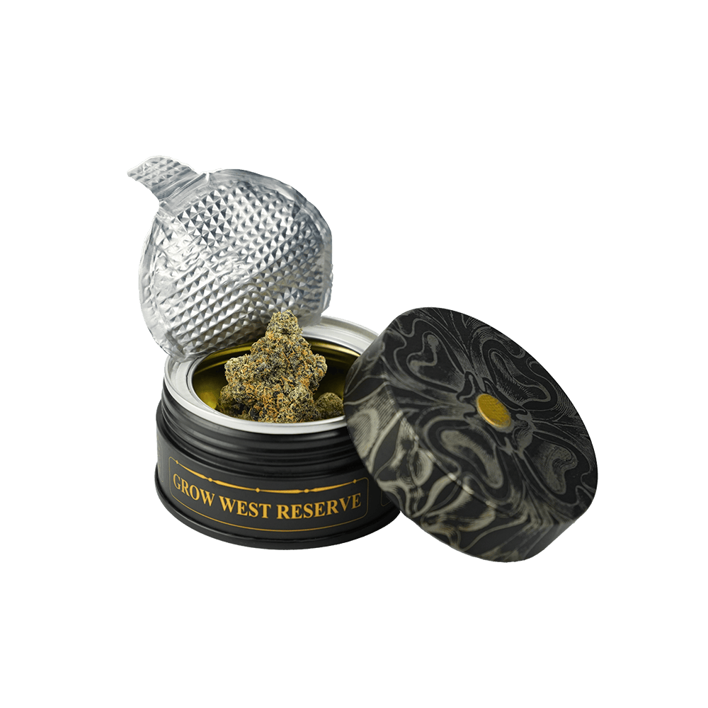 Our Reserve Flower is meticulously hand-trimmed, nurtured with utmost care and affection, and guaranteed over 30% THCa, promising unparalleled quality in each strain. Reserve is encased in elegant, fully recyclable black and gold tins that embody both sustainability and luxury. Discover the new standard of excellence with Grow West and taste the extraordinary.