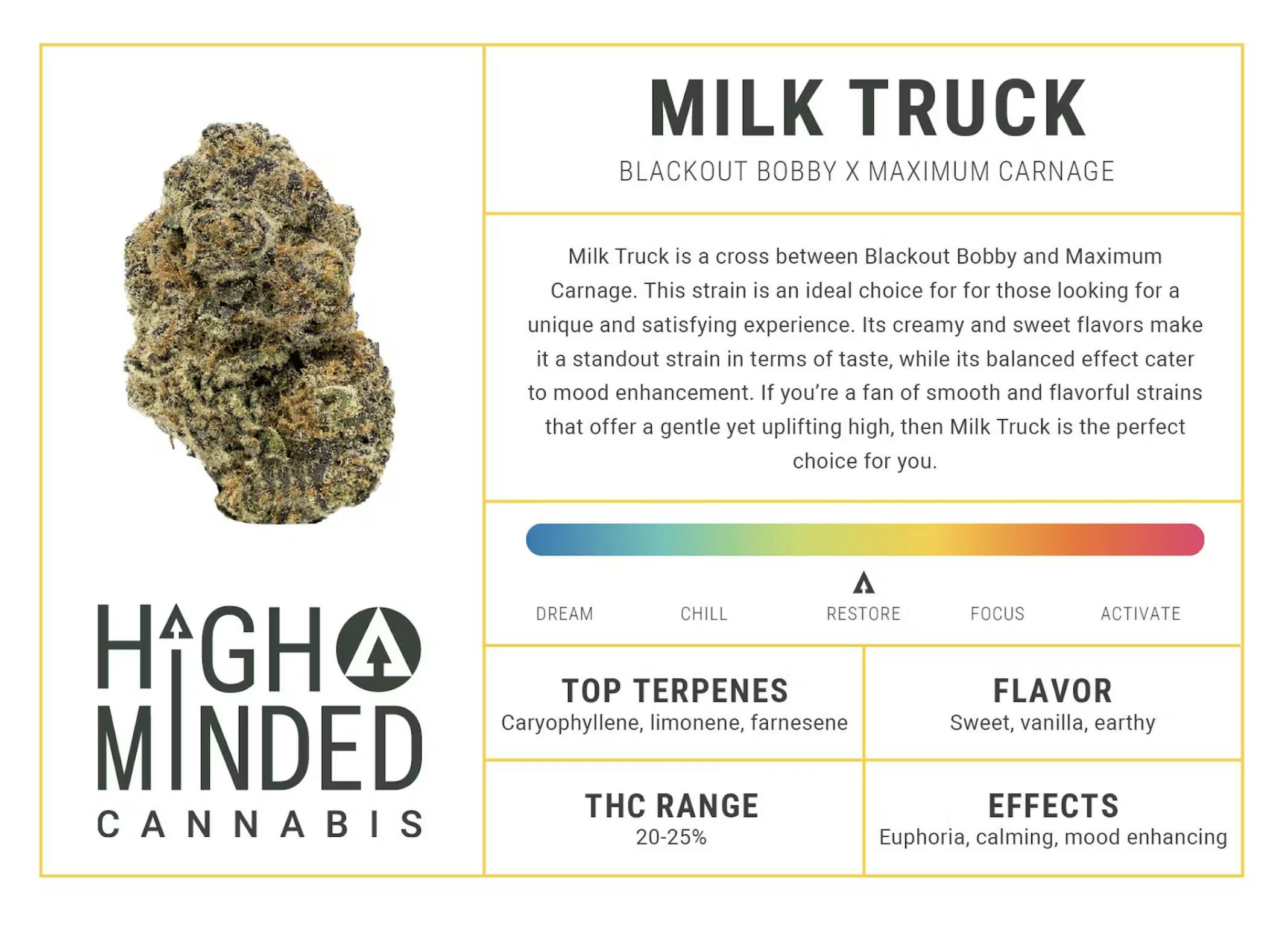 Milk Truck is a cross between Blackout Bobby and Maximum Carnage. This strain is an ideal choice for for those looking for a unique and satisfying experience. Its creamy and sweet flavors make it a standout strain in terms of taste, while its balanced effect cater to relaxation and mood enhancement. If you're a fan of smooth and flavorful strains that offer a gentle yet uplifting high, then Milk Truck is the perfect choice for you.