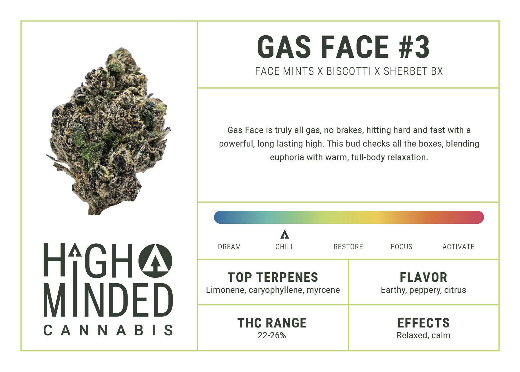 Gas Face is a unique and distinctive indica-leaning hybrid that is incredibly potent and aromatic. Its thick, lingering smoke is as gassy and in your face as its name suggests, with notes of diesel, tar, and ammonia underscored by a spicy earthy base. Gas Face is truly all gas, no brakes, hitting hard and fast with a powerful, long-lasting high. This bud checks all the boxes, blending a strong cerebral focus and euphoria with warm, full-body relaxation.