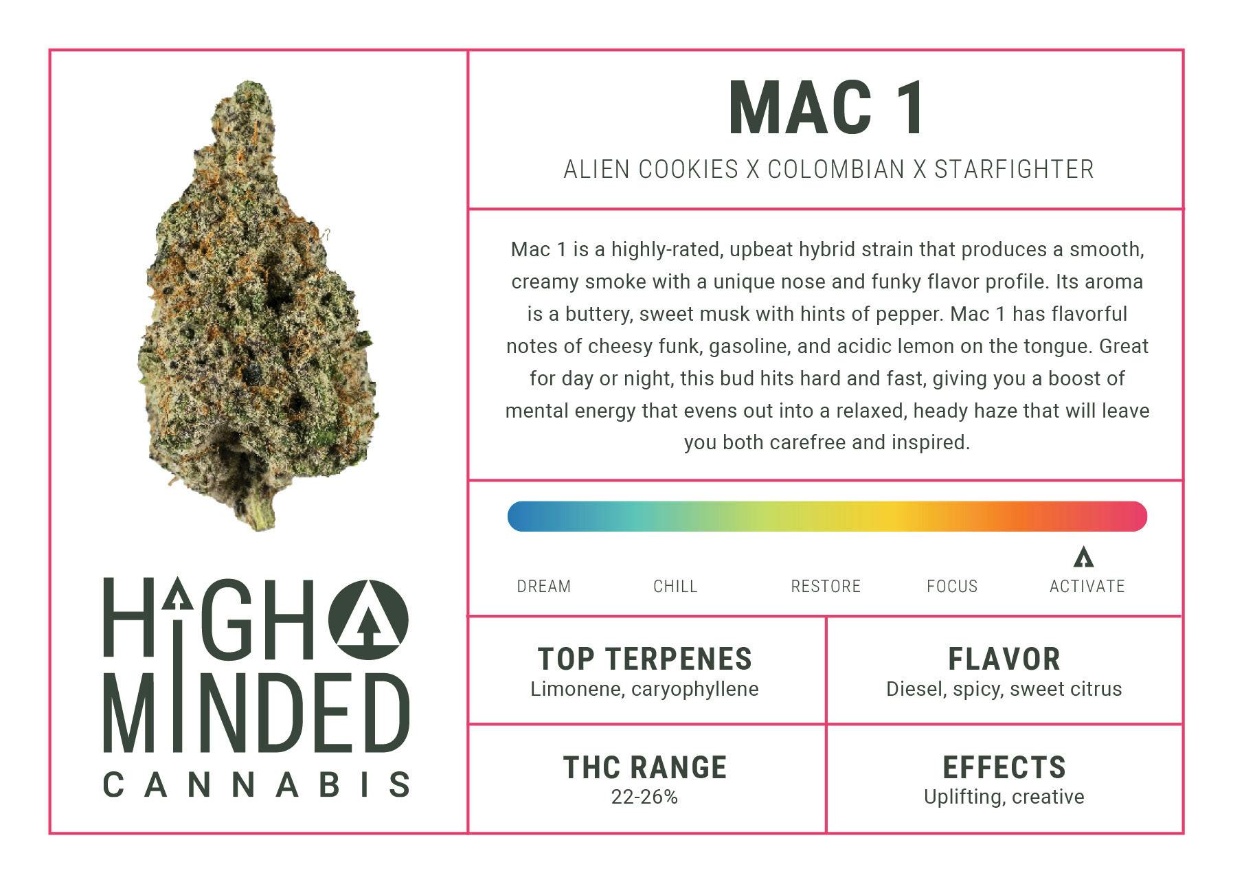 Mac 1 is a highly-rated, upbeat hybrid strain that produces a smooth, creamy smoke with a unique nose and funky flavor profile. Its aroma is a buttery, sweet musk with hints of pepper. Mac 1 has flavorful notes of cheesy funk, gasoline, and acidic lemon on the tongue. Great for day or night, this bud hits hard and fast, giving you a boost of mental energy that evens out into a relaxed, heady haze that will leave you both carefree and inspired.
