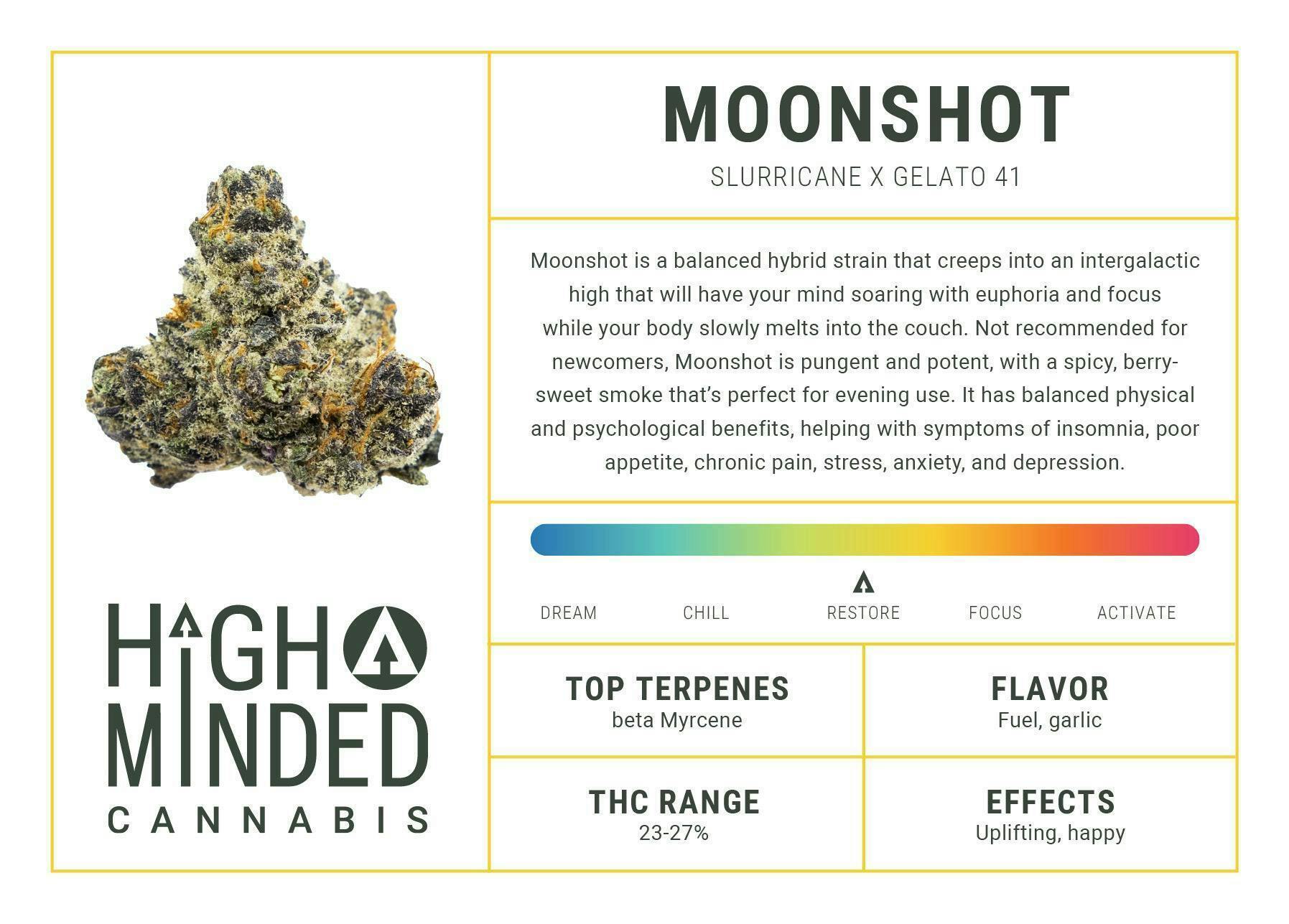Moonshot is a balanced hybrid strain that creeps into an intergalactic high that will have your mind soaring with euphoria and focus while your body slowly melts into the couch. Not recommended for newcomers, Moonshot is pungent and potent, with a spicy, berry-sweet smoke that’s perfect for evening use. It has balanced physical and psychological benefits, helping with symptoms of insomnia, poor appetite, chronic pain, stress, anxiety, and depression.