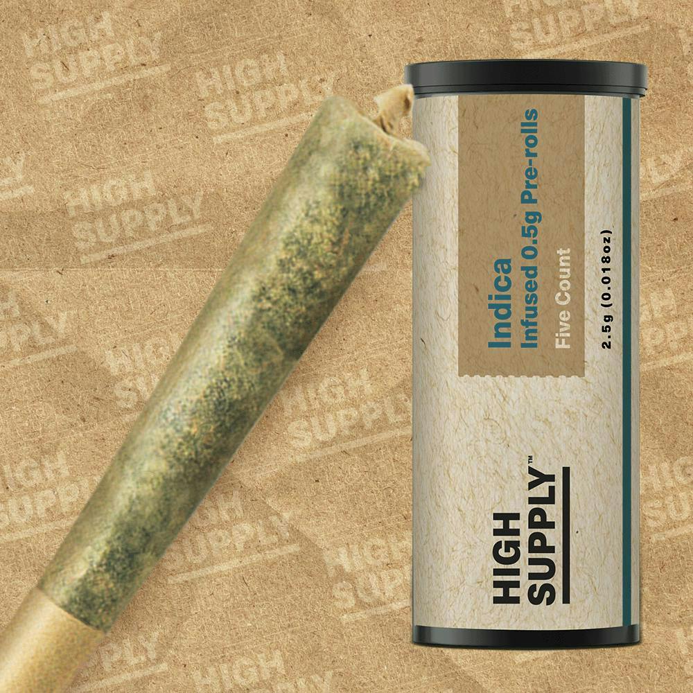 Infused Pre-Rolls from High Supply marries potency and portability, at a sweet price. Five 0.5g Pre-Rolls per package, at a 70:30 blend of lab-tested flower and sand of the same dominance. Each joint’s a one-way trip to a good time. Burn responsibly.