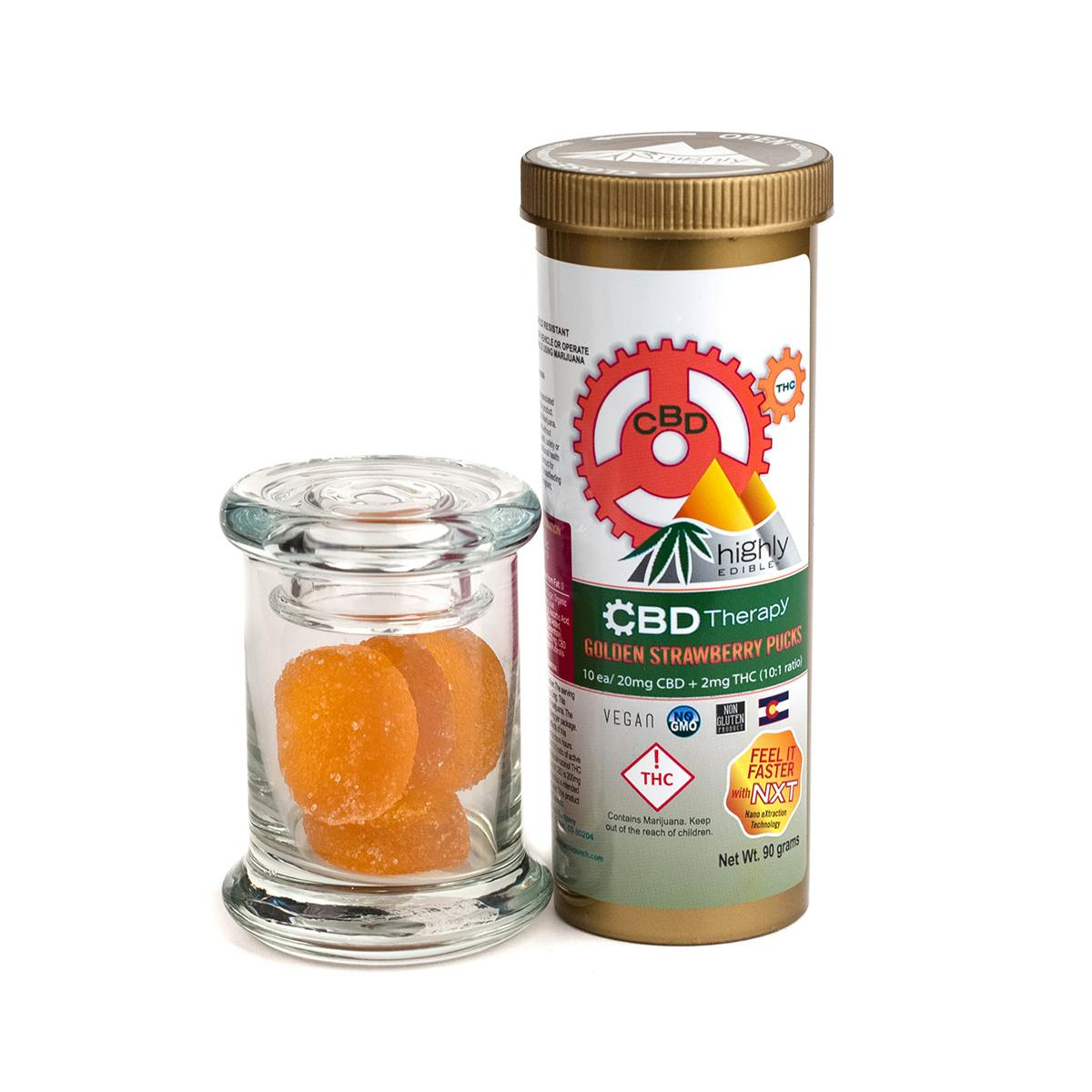 Highly Edible's CBD Therapy Golden Strawberry Pucks offer a delicious pack of strawberry-flavored gummies, all conveniently packaged in a child-proof container and crafted with 100% organic, vegan ingredients and the highest quality infused non-psychoactive cannabis. Each container contains 20mg of CBD and 2mg of THC.