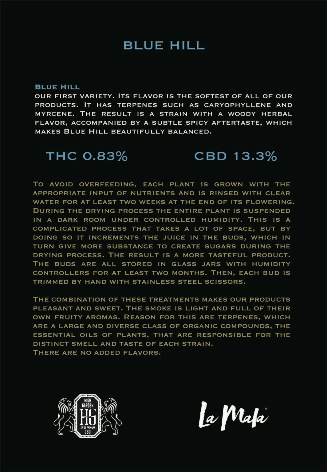 Its flavor is the softest of all of our products. It has terpenes such as caryophyllene and myrcene. The result is a strain with a woody herbal flavor, accompanied by a subtle spicy aftertaste, which makes Blue Hill beautifully balanced.