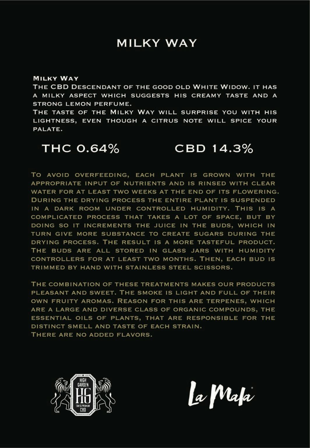 The CBD descendant of the good old White Widow. It has a milky aspect which suggests his creamy taste and a strong lemon perfume. The taste of the Milky Way will surprise you with his lightness, even though a citrus note will spice your palate.