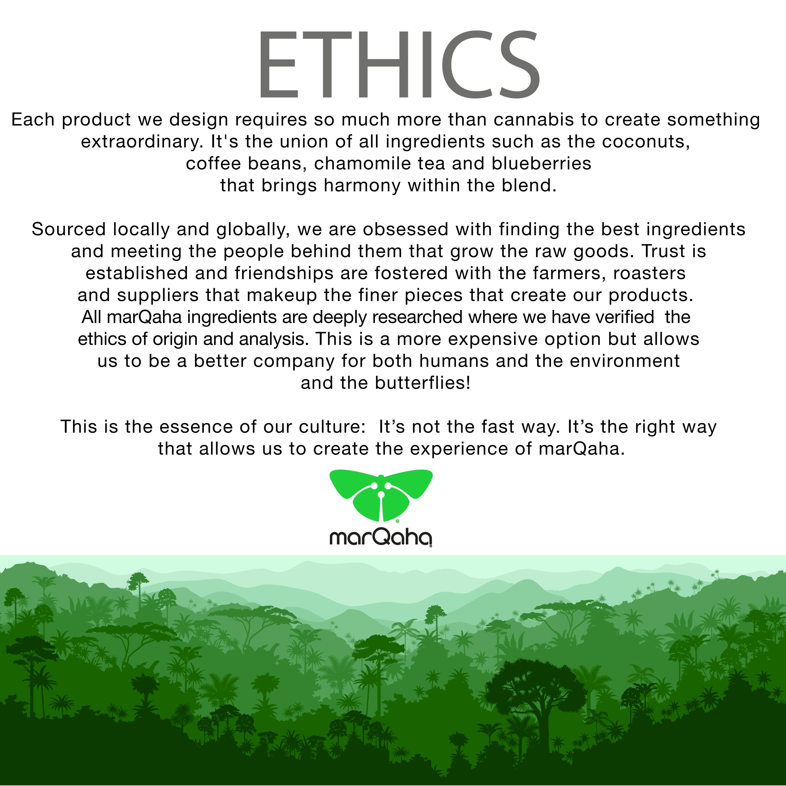 marQaha approaches our products with the saying “a chain is only as strong as its weakest link” and bring this wisdom to every day’s production. We have a delicate balance of hands-on production with small batch perfection by bringing unique ingredients such as coffee beans, chamomile tea, and blueberries together in harmony within the product blend. We source locally and globally, using only the finest ingredients and foster relationships with farmers, roasters, and suppliers to make the most trusted and high level cannabis good product possible. It isn’t the fast way, it’s the right way. It’s through slow but deliberate perfection that we are able to bring the harmonious power of cannabis into each marQaha product.
