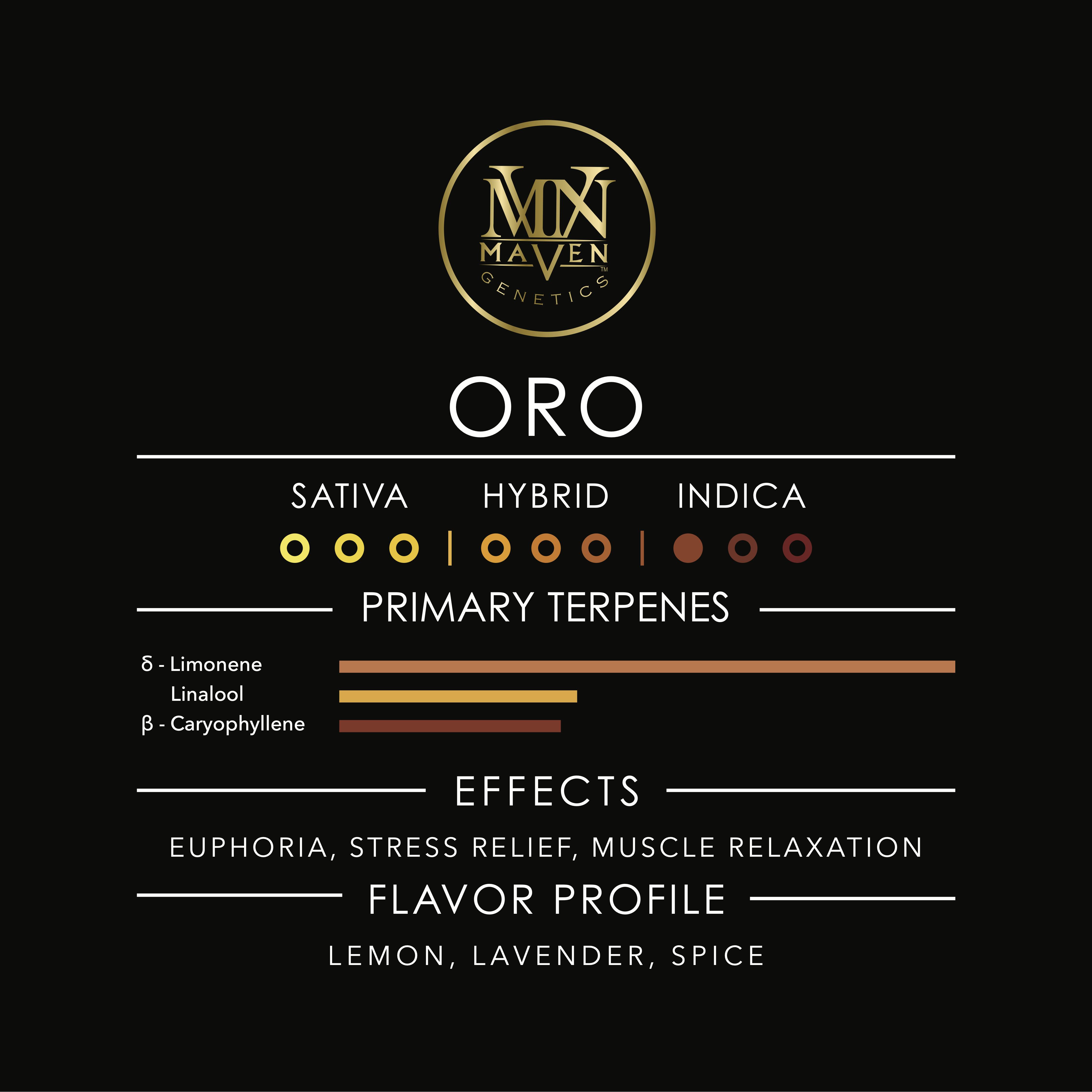 Oro, translating to "Gold" in English, is a refined, sophisticated Indica cross of our famous Golden Hour and Jealousy. These colorful nugs display vivid shades of violet, blue and green beneath a shining sea of Trichomes, complemented by clusters of golden Stigmas. Its flavor palate is just as colorful, with a depth similar to its parent strain Golden Hour, paired with notes of fresh lemon, sweet lavender, and warm spice. While this strain's Terpene Profile induces a sense of euphoria, its high Linalool content also amplifies its medicinal qualities, making it as great of a choice for healing as it is for recreational use. This descendant of Blue Lotus is nothing short of exceptional, and offers some of its same qualities that you know and love, in a new and exciting cross that's as good as gold.