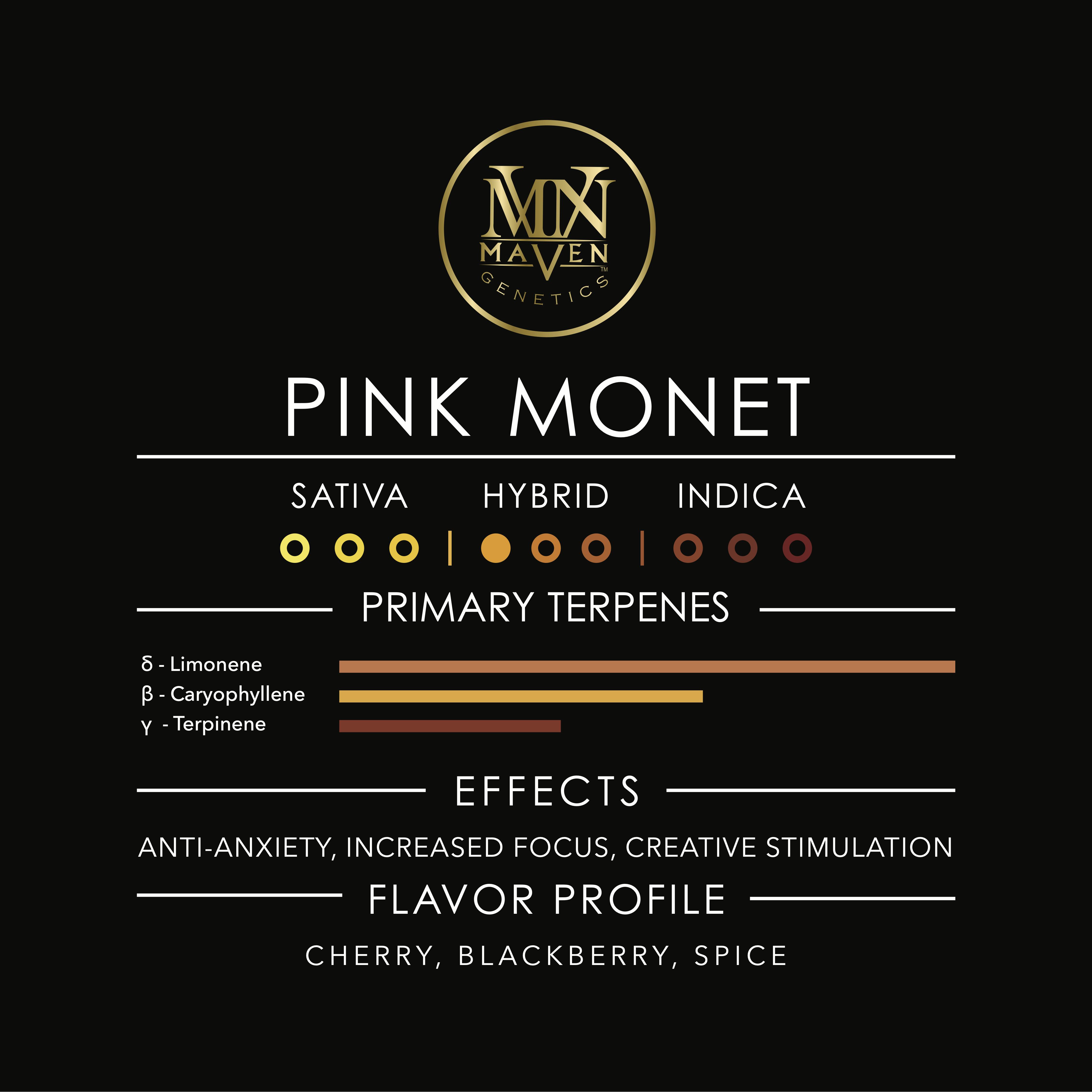 Pink Monet is a robust, Sativa-dominant Hybrid cross between our award-winning Sour Sangria and Twisted Cherries. A sweet, floral, and velvet-smooth exhale balances the tart flavor that lingers on the tongue, creating a lively sweet, and sour profile. This strain retains the finest qualities of each parent; reported effects include a cerebral uplift, appetite stimulation, increased focus, and creativity that slowly progress into a dreamy, blissful state of tranquility.