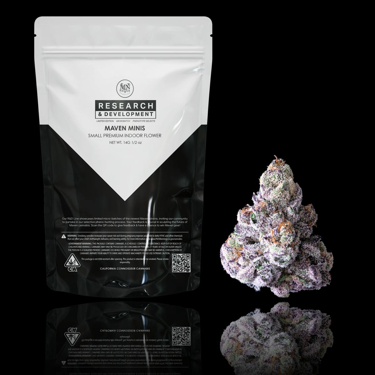 Our Research & Development line grants us the opportunity to make our community as an integral part of our exclusive Pheno-Hunting process. Integrating consumer testing and feedback, we then decide which Phenotypes will be chosen for production as a part of our next Seasonal Collection. Our R&D Line showcases limited micro-batches of the newest Maven strains, inviting our community to partake in our selective pheno-hunting process. Your feedback is crucial in sculpting the future of Maven cannabis. Scan the QR code to give feedback & have a chance to win Maven gear!