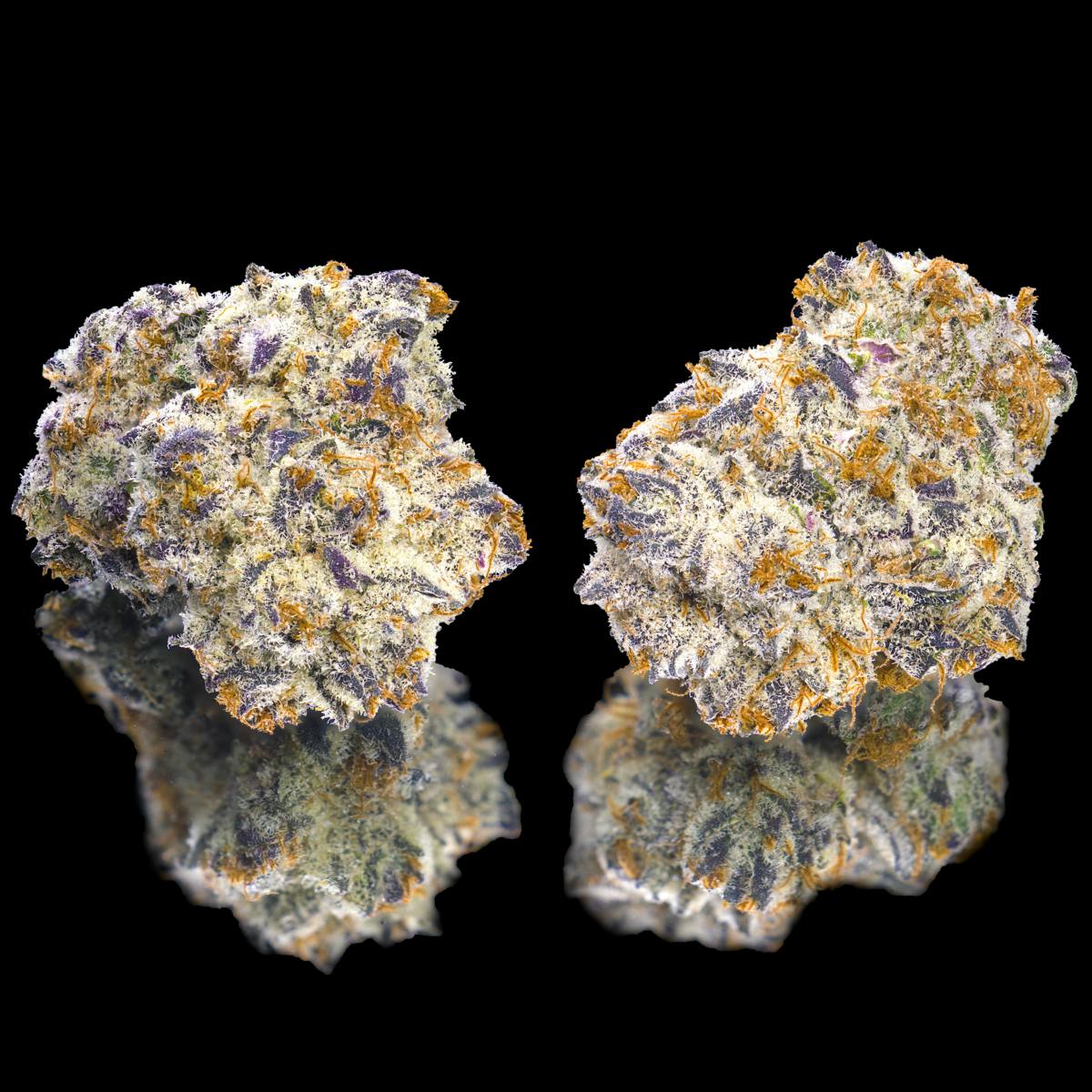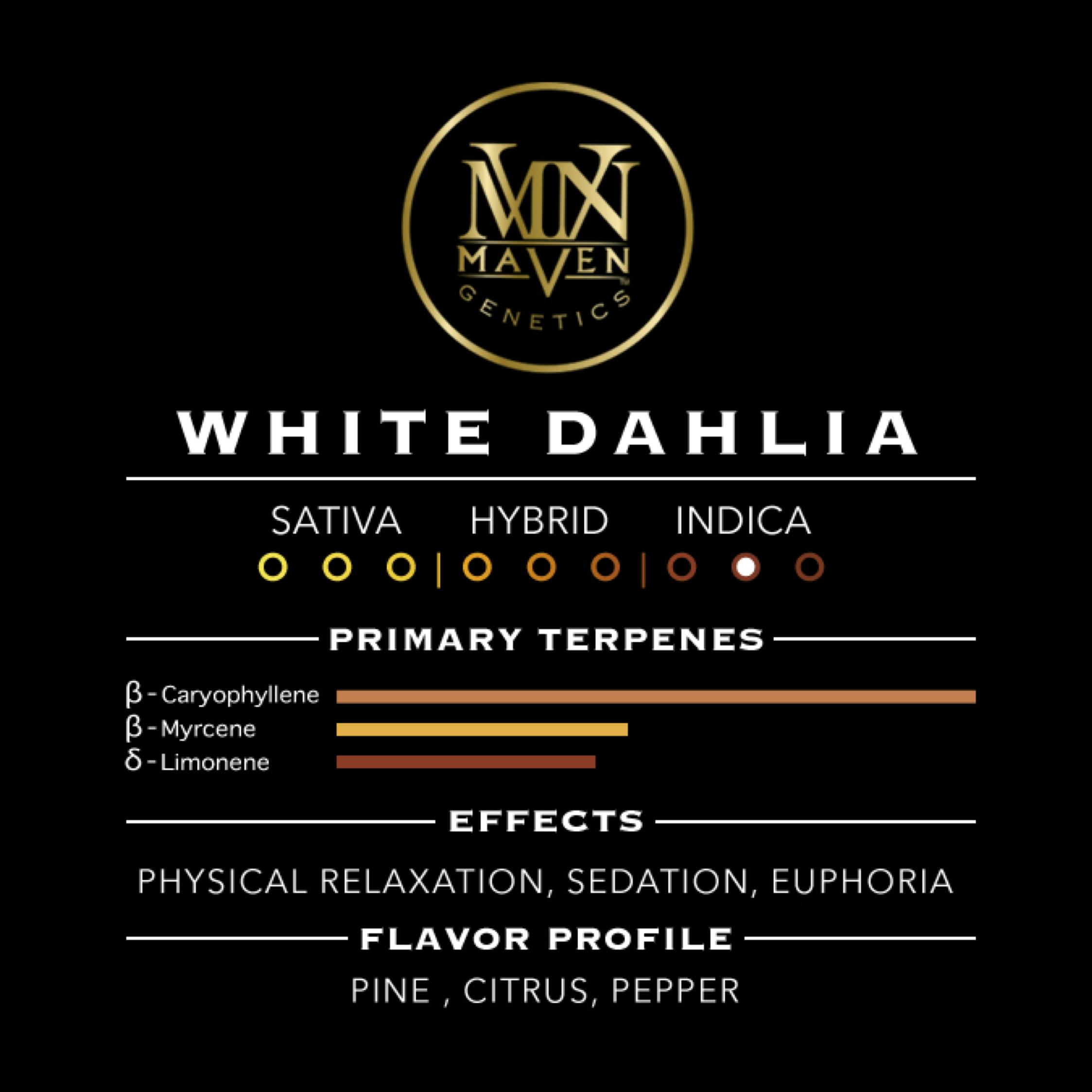 White Dahlia is the fourth and newest member of our exclusive Black Box Collection. It is the epitome of symmetry, richness, and beauty all in a full-bodied Indica package. A cross of Pure Michigan F2 and our very own Medusa, this strain hits heavily with sweet, creamy, citrus, pine, and peppery notes from spark to exhale. With the stoney high of its parent strain Medusa shining through, your body will melt while your mind enters a dream like state for hours on end. The violet and amber nugs exude the same elegance and refinement of its namesake flower and provide a sophisticated experience from start to finish.