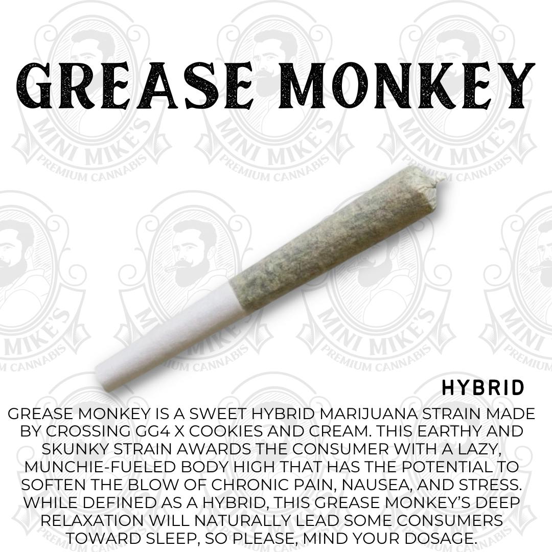 Grease Monkey is a sweet hybrid marijuana strain made by crossing GG4 x Cookies and Cream. This earthy and skunky strain awards the consumer with a lazy, munchie-fueled body high that has the potential to soften the blow of chronic pain, nausea, and stress. While defined as a hybrid, this Grease Monkey’s deep relaxation will naturally lead some consumers toward sleep, so please, mind your dosage.
