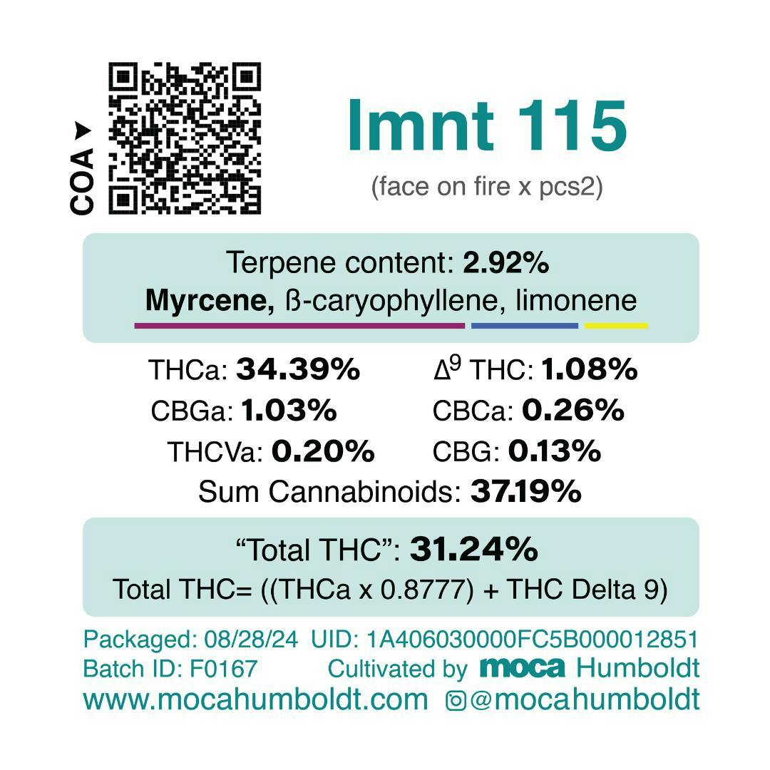 Strain Lineage: (Face On Fire x PCS2) | MOCA Flowers 1/8th Jars will always be 1-4 nugs! Flowers are meticulously trimmed and sorted by hand. Always grown in soil. Jars are 56% post consumer recycled glass and lids are 100% reclaimed ocean plastic. Dominant Terpene Profile: myrcene