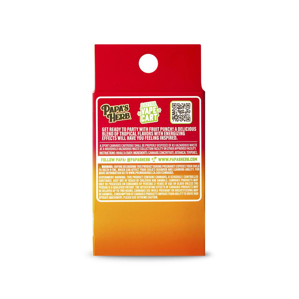Experience Papa’s Herb Fruit Punch Cartridge, a sativa vape cartridge with a vibrant mix of tropical fruit flavors and a smooth inhale. This flavorful vape is commonly associated with uplifting and energizing effects, making it ideal for daytime use. Effects may vary. Intended for adult use only.
