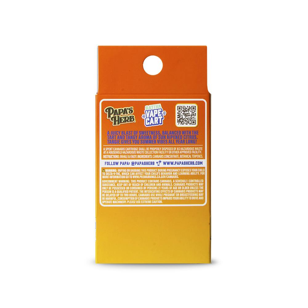 Experience Papa’s Herb Tangie Cartridge, a sativa vape cartridge with bright, sun-ripened citrus flavor and a smooth inhale. This refreshing device is commonly associated with uplifting and energizing effects, making it ideal for daytime use. Effects may vary. Intended for adult use only.