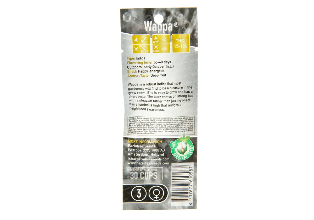 Wappa was bred by Amsterdam’s Paradise Seeds, which claims to have developed the strain from a sweet-scented Skunk phenotype. The end result, according to the seed bank, is a reliable, productive plant with a deep, fruity flavor.