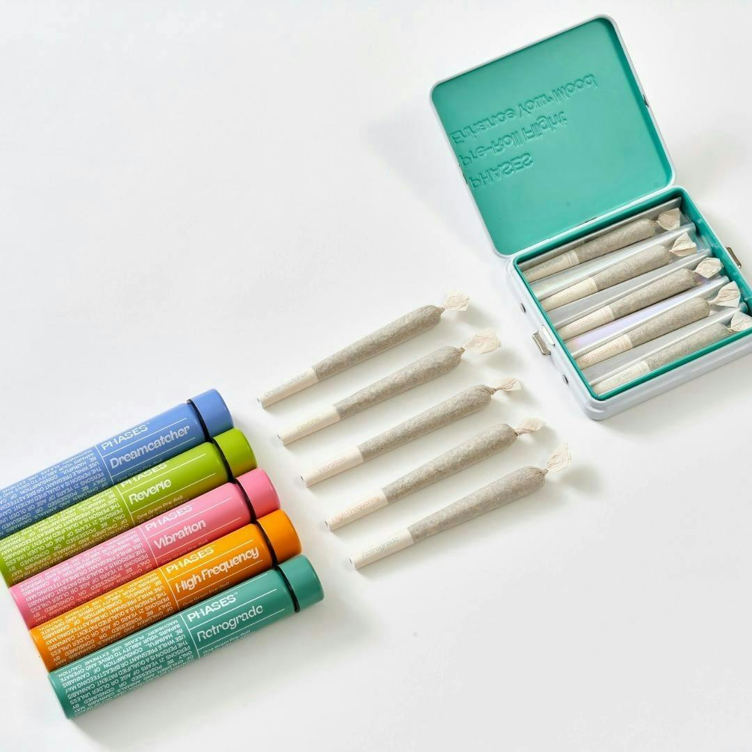 Our Flight contains five 0.5g pre-rolls, one of each effect, inviting you to explore and experience the full range of PHASES in the convenience of one pack. Dreamcatcher: Indica for rest. Reverie: Hybrid for relaxation. Vibration: Sativa for socialization. High Frequency: Sativa for energy. Retrograde: Indica for recovery