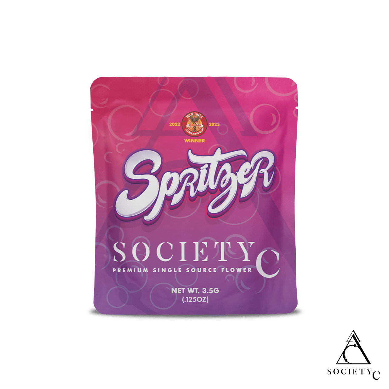 Society C's Spritzer is a strain made by crossing Runtz with MAC and Grape Pie, and it has garnered acclaim by winning first place in the High Times Michigan 2022 and 2023 Cannabis Cup for Adult Use Indica Flower. This strain boasts a unique blend of terpenes, including Limonene, Linalool, and Caryophyllene, contributing to its iconic aroma and effects. With a delightful fusion of fruity, citrus, flowery, and peppery notes, each inhale offers a bold and fresh experience. The strain is well-known for producing creative, uplifting, and euphoric effects.