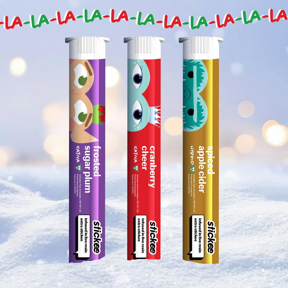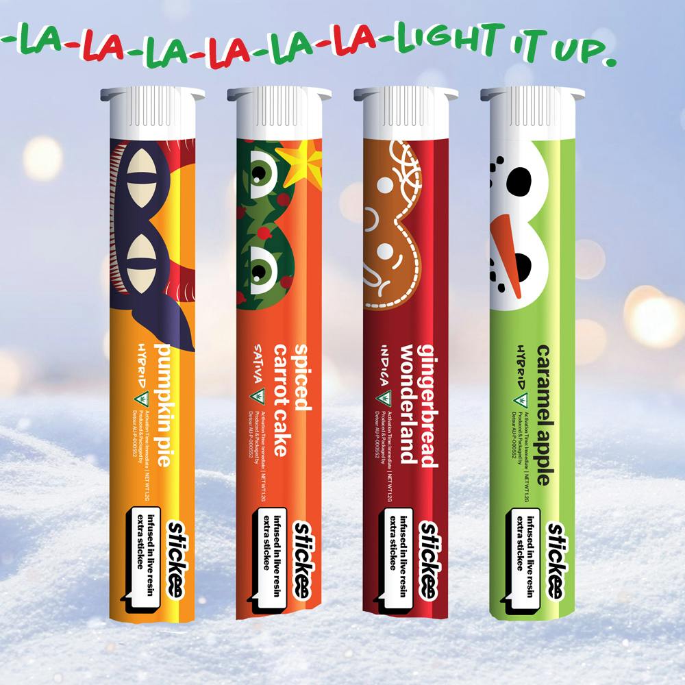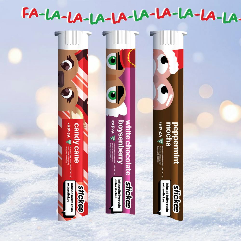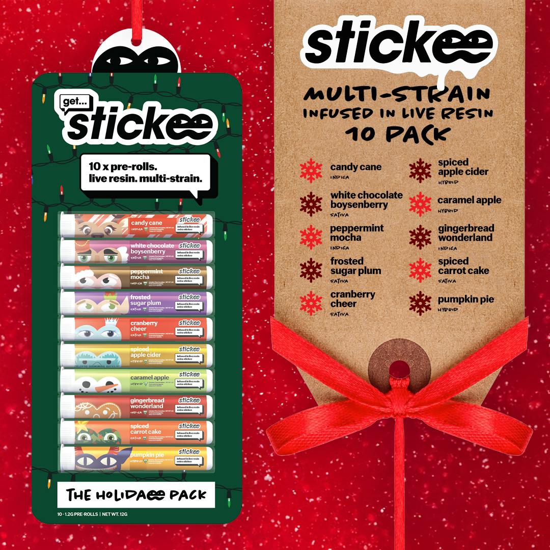 The Stickee Holiday Pack is here with 10TEN10 infused live resin pre-rolls in flavors that belong on the dessert table . . . Candy Cane, Peppermint Mocha, Gingerbread Wonderland, Pumpkin Pie, and more. Think of it as a holiday tasting flight, except everyone leaves higher than the tree. Each roll is smooth, balanced, and built for good company and bad sweaters.