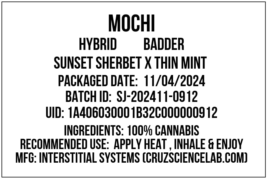 Mochi, also known as Mochi Gelato, Mochilato and Gelato 47, is a cross of Sunset Sherbet and Thin Mint Girl Scout Cookies created by San Francisco breeder Sherbinskis. According to Sherbinskis, it tastes like the Japanese frozen dessert for which it’s named, fruity and sweet with a hint of mint. The strain’s floral scent mixes with earthy, vanilla undertones.
