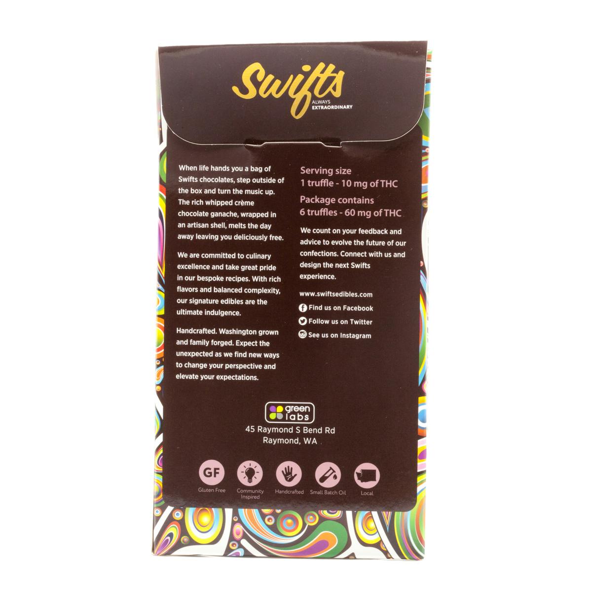 Crème ganache dipped in milk chocolate and topped with drizzle, Swifts Milk Truffles delivers a decadent high. Breakthrough the first layer of Milk Truffles’ chocolate shell to reveal a creamy and rich whipped ganache blended with cannabis. This THC infused chocolaty treat will capture your senses and free your mind. Individually wrapped,10mg packs of 6, 60mg.