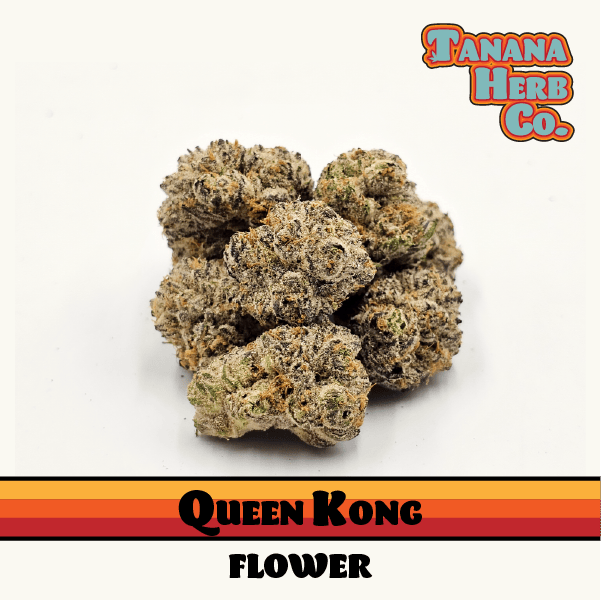 Queen Kong, cultivated by Tanana Herb Company. This indica-dominant hybrid is the result of crossing GG#4 and Trophy Wife, resulting in a majestic creation. Queen Kong showcases vibrantly colored nugs, captivating the eye with its visual allure. Prepare to be consumed by a dense smoke that delivers a heavy, relaxed high, soothing both body and mind. Experience the regal embrace of Queen Kong and surrender to its tranquil dominion. Let the queen reign as you indulge in pure bliss.