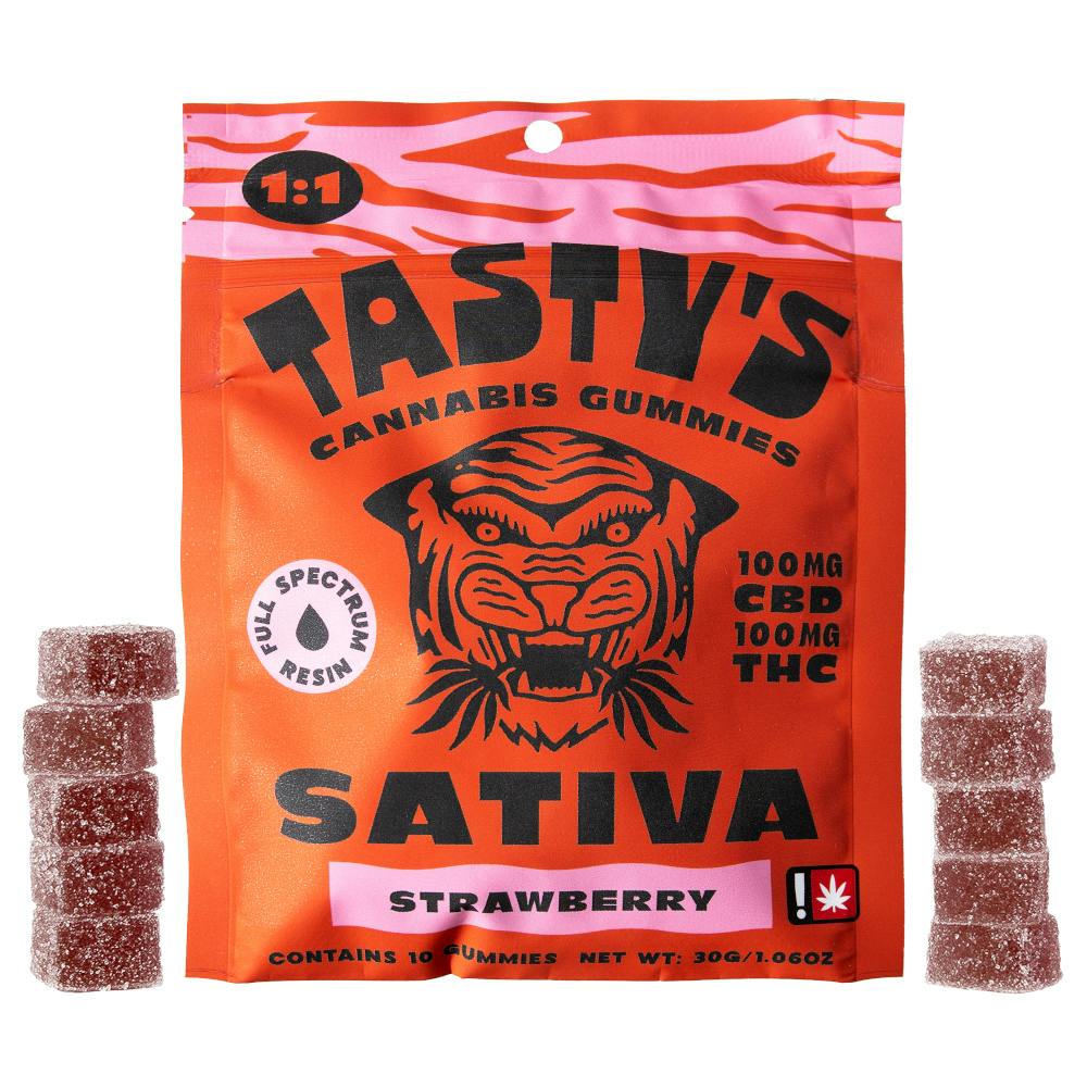 ![Tasty's - [10pk] 1:1 Strawberry - Sativa - 1](https://weedmaps.com/images/photos/products/002/267/197/5284192_TST_BarbSystem_Gummies_Strawberry_Harmony.png?auto=format&fit=fill&fill=solid&fill-color=fff&w=540&h=540&blend-mode=darken&blend-color=%23F9F9F8)