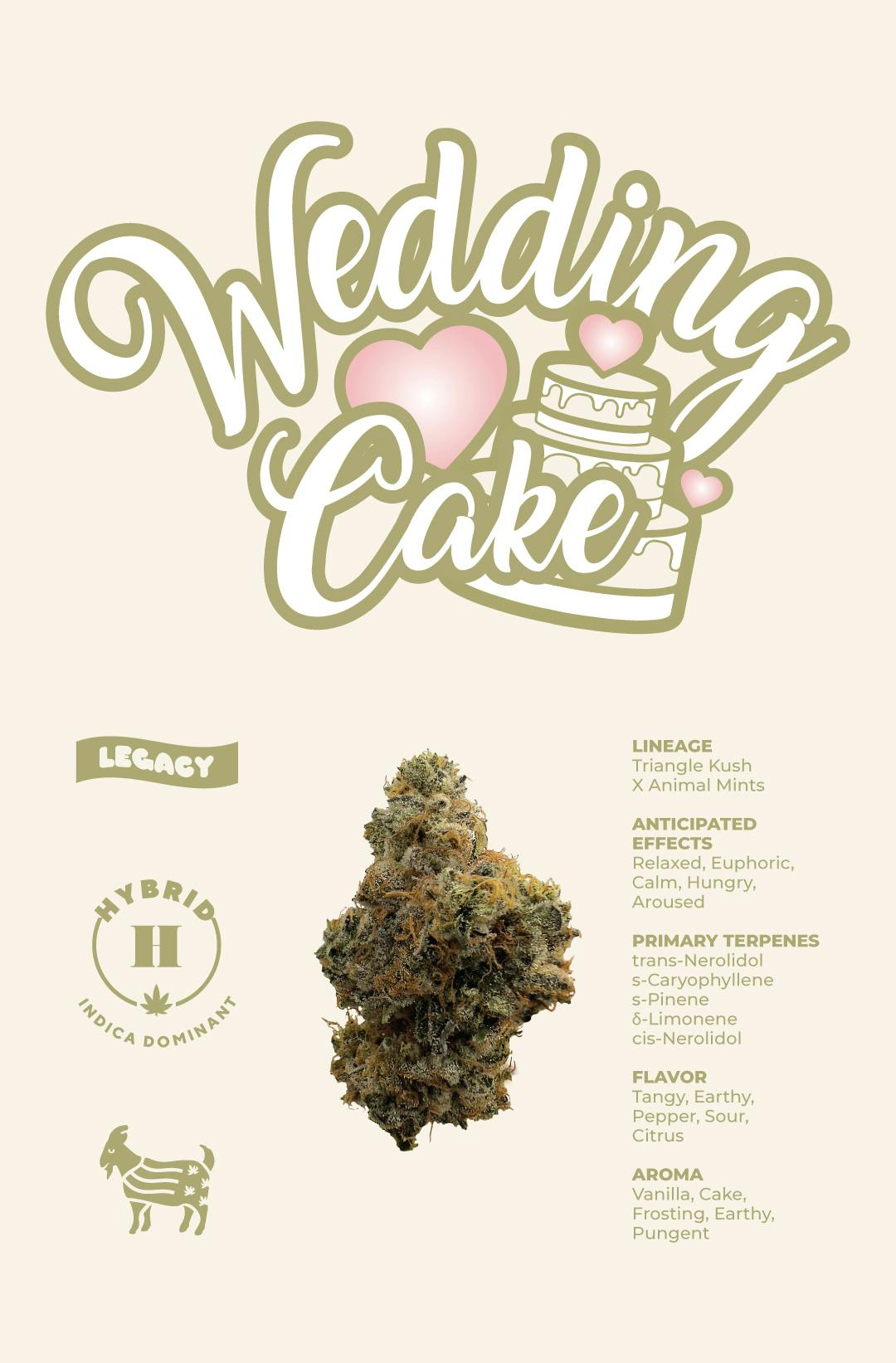 Wedding Cake, also known as Pink Cookies, is a rare phenotype created by Seed Junky Genetics when the breeder crossed a mother Triangle Kush with Animal Mints pollen. The L.A. based Jungle Boys named Wedding Cake because of its sparkling resin and vanilla cake frosting aroma.
