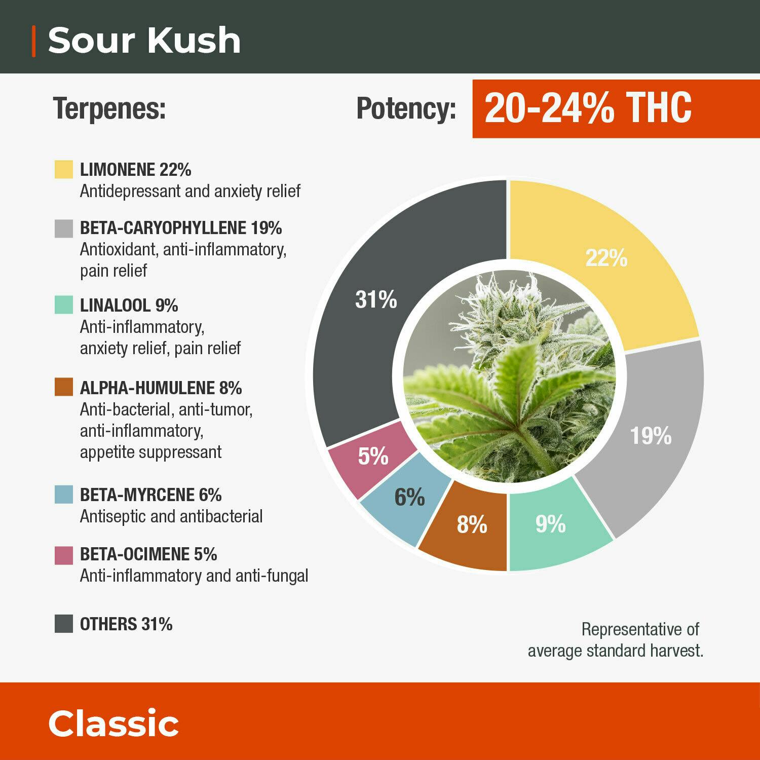 Sour Kush stays true to its Kush roots, this sativa-dominant hybrid has a strong pungent smell and tastes like dank citrus.