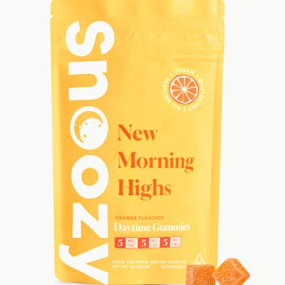 Waking up is hard sometimes. Find inspiration with Snoozy New Morning Highs Gummies. New Morning Highs help you greet the day with a calm mind, putting a pep in your step that will last well into your day. A perfect compliment to Snoozy Sleep with Benefits. Each gummy contains cannabinoids such as THC, CBD and CBG. Formulated with organic & all-natural ingredients to help you seize the day.