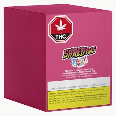 SHRED’ems Red Apple Peach Party Pack has 10 packs of MAX10 gummies, each with 10mg THC for a total 100MG THC PER PACK! These juicy indica gummies blend the crisp sweetness of red apple with the smooth, mellow flavour of ripe juicy peach.