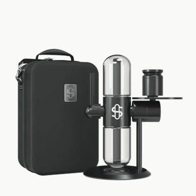 Introducing the newest sensation from Stündenglass, the Kompact Gravity Infuser. The Kompact features the same patented 360° gravity system, dynamic design, and immersive experience as the original, now available in a more refined, portable size that includes a custom-fit travel case.Coming in at just under a foot tall, the Kompact is exactly what you need to enjoy the benefits of Stündenglass in an easy to handle package. The smaller globes hold about two thirds of the volume, or 2 cups, compared to the full size, which creates cooler and faster pulls.The travel case is carefully crafted with high grade fabric and form-fitted to cradle the Kompact Stündenglass, which arrives full assembled. A beautiful metal inlayed logo plate adorns the front with an easy to use zipper, carrying handle and strap for over the shoulder use. Inside, there is space for accessories including a handy pocket to store anything extra you want to bring along with you.Designed for functional versatility, the Kompact Gravity Infuser is a complete set that includes an aluminum bowl kit and a glass liner but can also connect to any smoking or vaporization device with a 14mm male joint. Also included is a 3-foot silicone hose that can be connected to the 45° adjustable mouthpiece for direct draws or a steady stream of smoke for contactless consumption. The Kompact is a sophisticated and elegantly designed 360° rotating glass device that generates kinetic motion activation via cascading water displacement, opposing airflow technology, and the natural force of gravity. It is constructed using the highest quality materials, including borosilicate glass globes and aircraft-grade anodized aluminum.