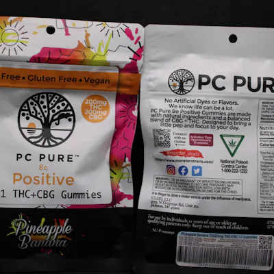 200MG-Sativa-10PC Pineapple Banana The PC Pure Pineapple Banana 1:1 THC + CBG Gummies (200mg) are a balanced, "Be Positive" edible formulation designed to provide a functional and uplifting daytime experience. These gummies are part of the Monster Xtracts family and are crafted in licensed small batches in Michigan. Product Highlights Flavor Profile: A tropical blend of sweet pineapple and smooth banana, made with natural ingredients and no artificial dyes or flavors. Total Cannabinoids: 400mg total per package. 200mg THC 200mg CBG (Cannabigerol) Format: Typically sold as a 10-pack, with each individual gummy containing 20mg of THC and 20mg of CBG. Dietary Features: These gummies are vegan-friendly (made with plant-based pectin), gluten-free, and fat-free. The 1:1 THC + CBG Experience Targeted Effects: This ratio is specifically designed to bring "pep and focus" to your day. While THC provides a euphoric high, CBG (often called the "mother of all cannabinoids") is included to support mental clarity and mood enhancement without heavy sedation. Potential Therapeutic Benefits: CBG is being researched for its potential to help with anxiety, chronic pain, and focus. Reported Feelings: Users often describe the experience as being happy, energetic, focused, and calm. Usage & Dosing Onset Time: As a traditional digested edible, the activation time typically ranges from 45 minutes to 2 hours. Duration: The high can be long-lasting, typically persisting for 6 to 12 hours.