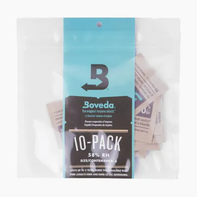 Boveda's patented 2-way humidity control continually responds to ambient conditions by adding or removing moisture to affect the enclosed environment and deliver the pre-determined relative humidity (RH) level printed on the pack. It’s impossible for Boveda to over-humidify beyond the RH on the pack. That’s why our usage instructions talk about minimums, not maximums. There’s no such thing as using “too much”. More than the minimum will just last longer. 58% 4g: Uses: Terpene retention and protection from moisture loss Supports: Up to 1/2 oz. (14g) Includes: (10) 58%, 4g unwrapped Boveda in a resealable bag 62% 4g: Uses: Terpene retention and protection from moisture loss Supports: Up to 1/2 oz. (14g) Includes: (10) 62%, 4g unwrapped Boveda in a resealable bag