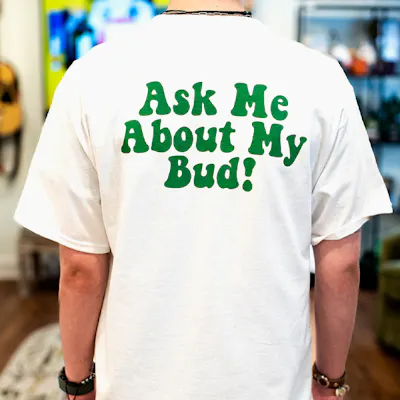 Start the conversation without saying a word in the Ask Me About My Bud! T-Shirt. Designed for comfort and everyday wear, this tee features soft, breathable fabric and a relaxed fit, paired with a bold, playful statement that’s perfect for sparking chats and sharing your love for great flower. Whether you’re hanging at home, out with friends, or stopping by the shop, it’s a fun, laid-back way to show your cannabis pride and your BestBuds vibe.